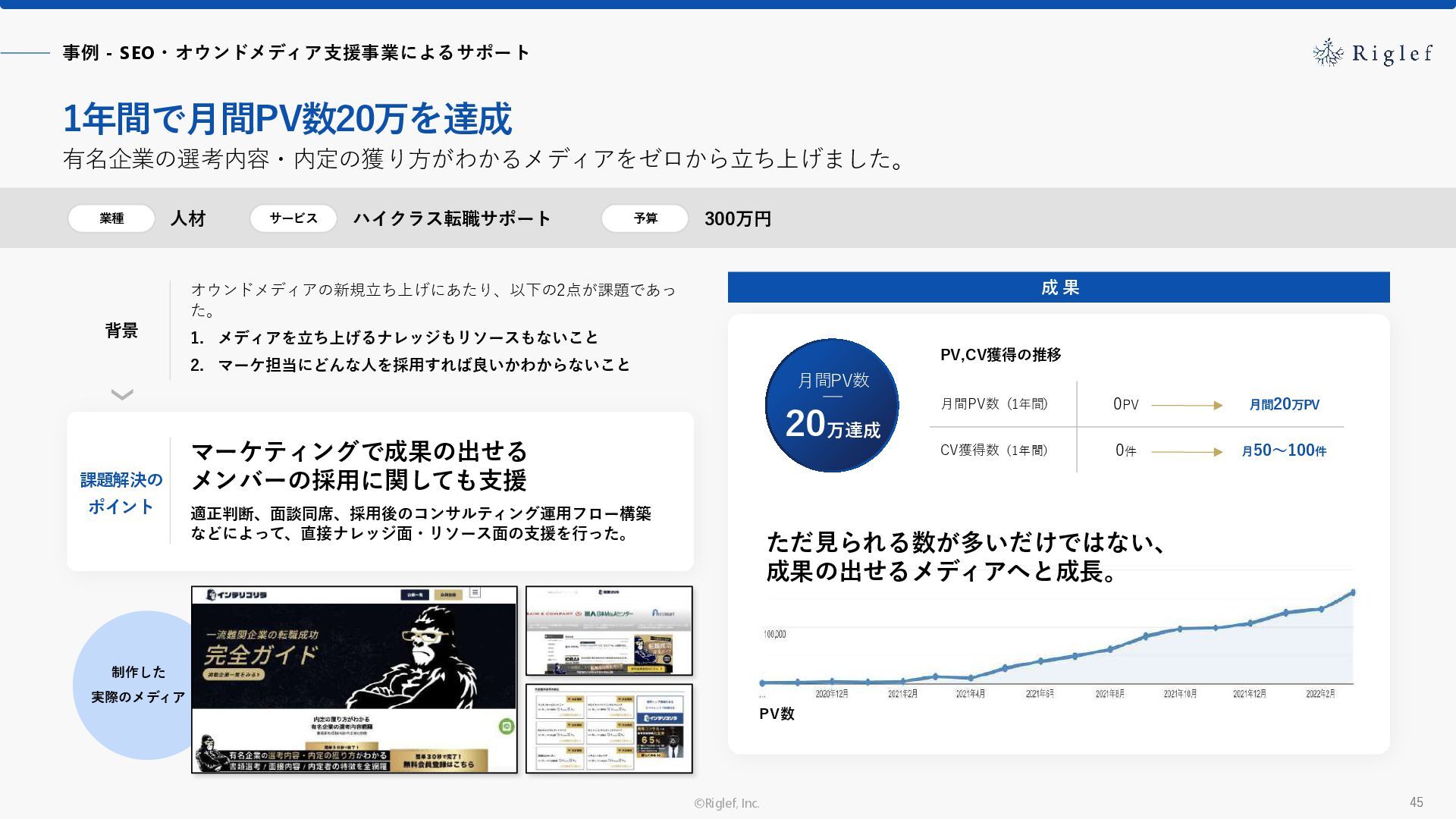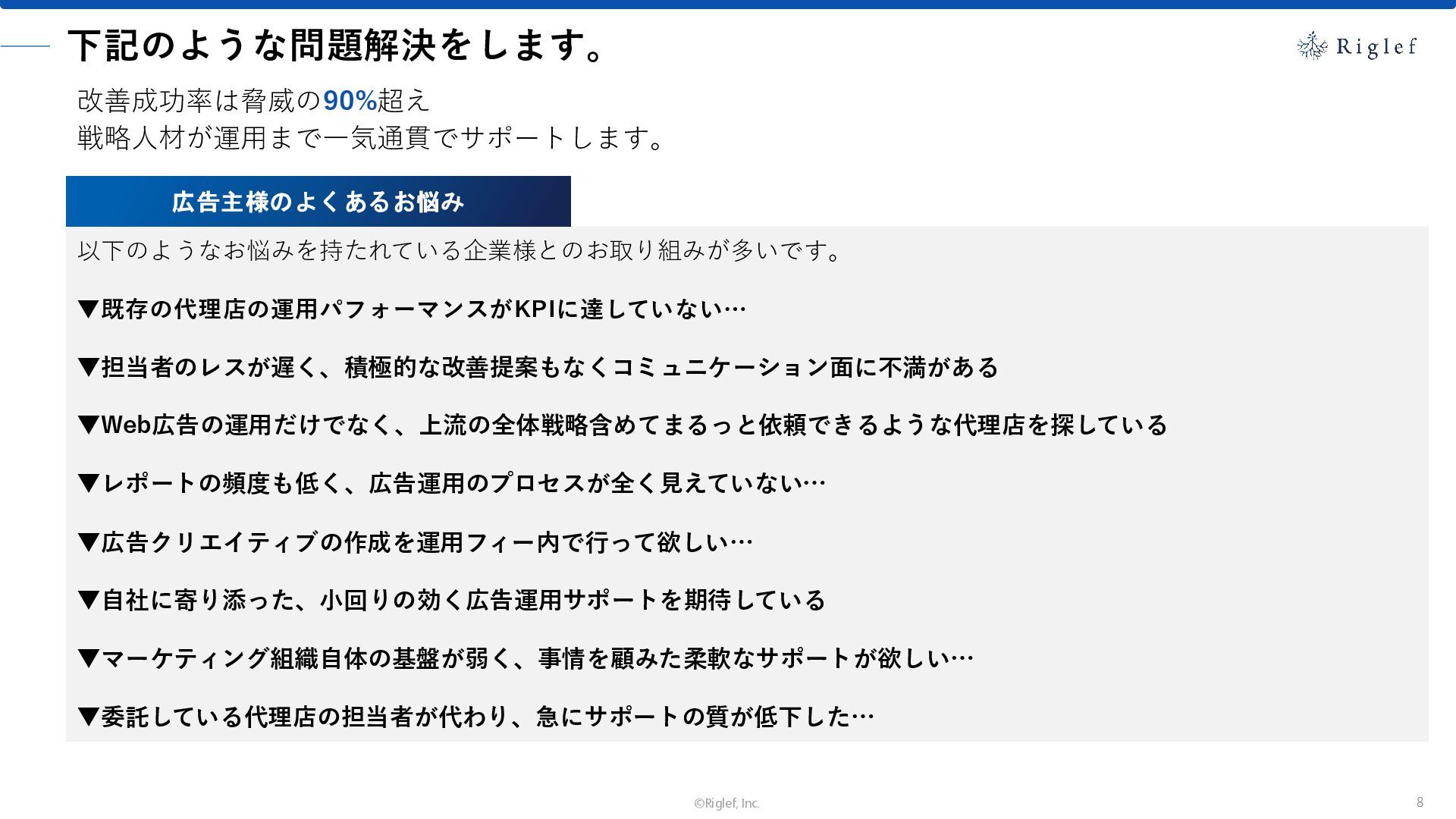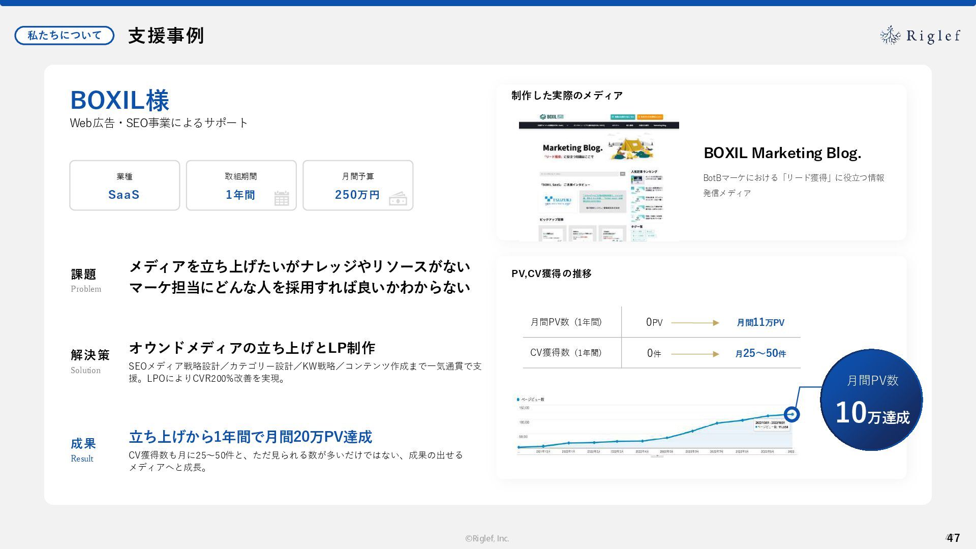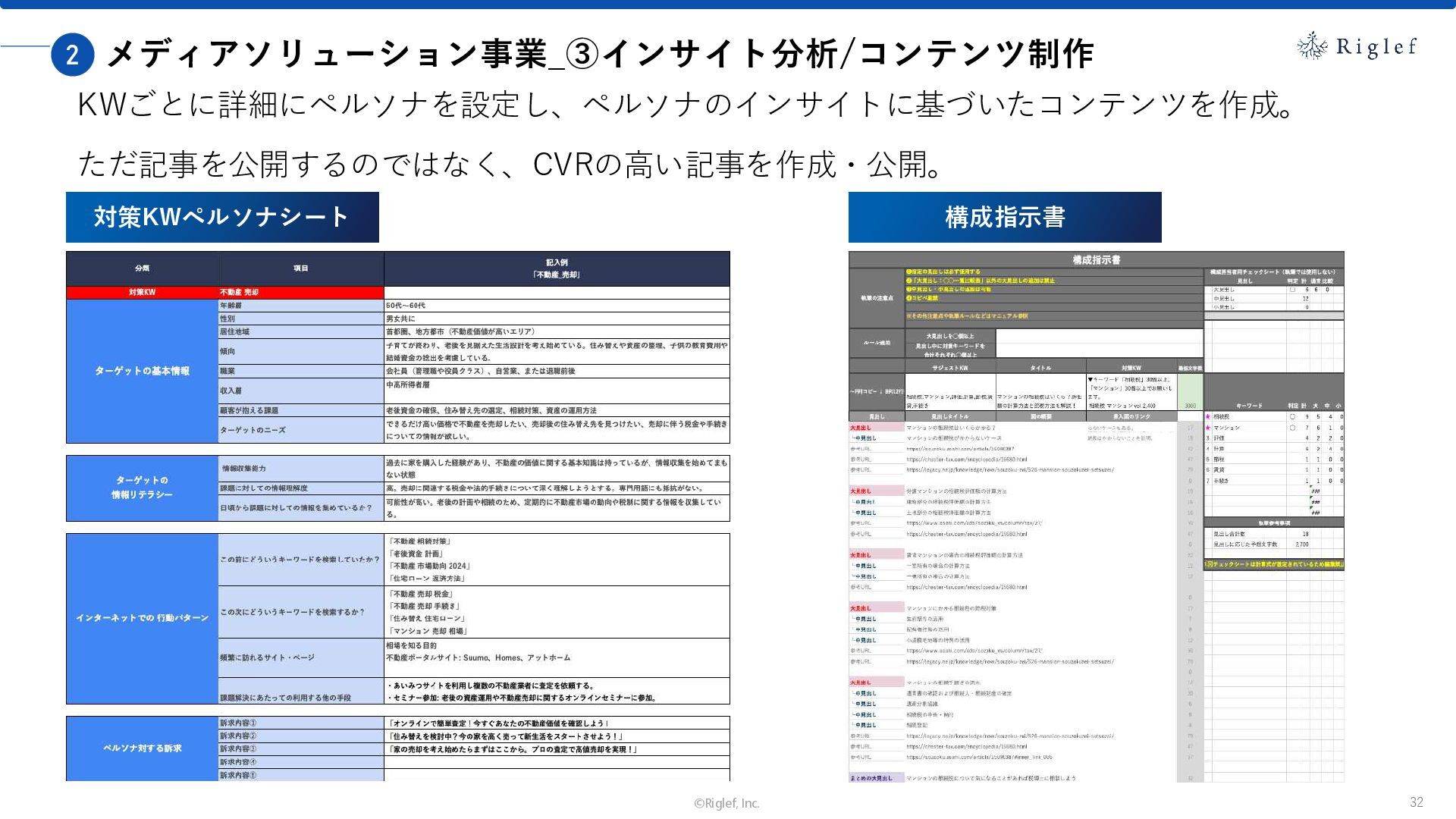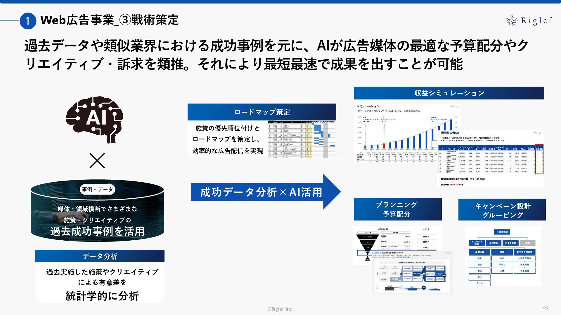 果 背景 課題解決の ポイント 業種 サービス 金融 M&A仲介 Webマーケティングを担当できる人材がいなかった。 結果、クライアントにとって以下が喫緊の課題であった。 1. 獲得単価が平均よりも高額であること 2. 問い合わせ数がKPIに対して少ないこと ユーザーのインサイト分析に 注力した設計へ 予算 1,400万円 施策 CPA(1ヶ月半) 40,000円 50%改善 20,000円 CPA(半年間後) 20,000円 90%改善 4,300円 広告予算 550万円 850万UP 1,400万円 CPA改善 90%達成 ¥20,000 ¥4,300 ¥0 ¥20,000 ¥40,000 元々 1ヶ月 6ヶ月 期間 CPA 50%改善 90%改善 CPA価格改善の推移 使用した広告種類 1. サービスの対象となるユーザー像を深掘りし、面談のキャンセルが 頻発する原因等を分析。 2. 仮説をもとに構成を組み直したうえで、インサイトに刺さるようLP を設計。