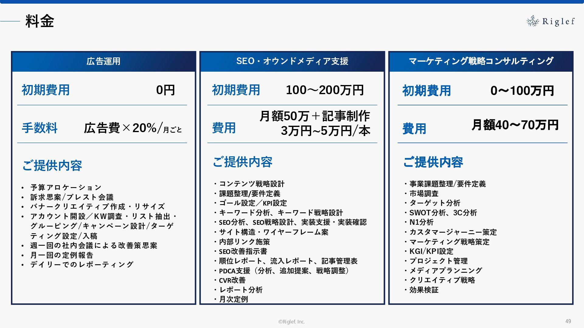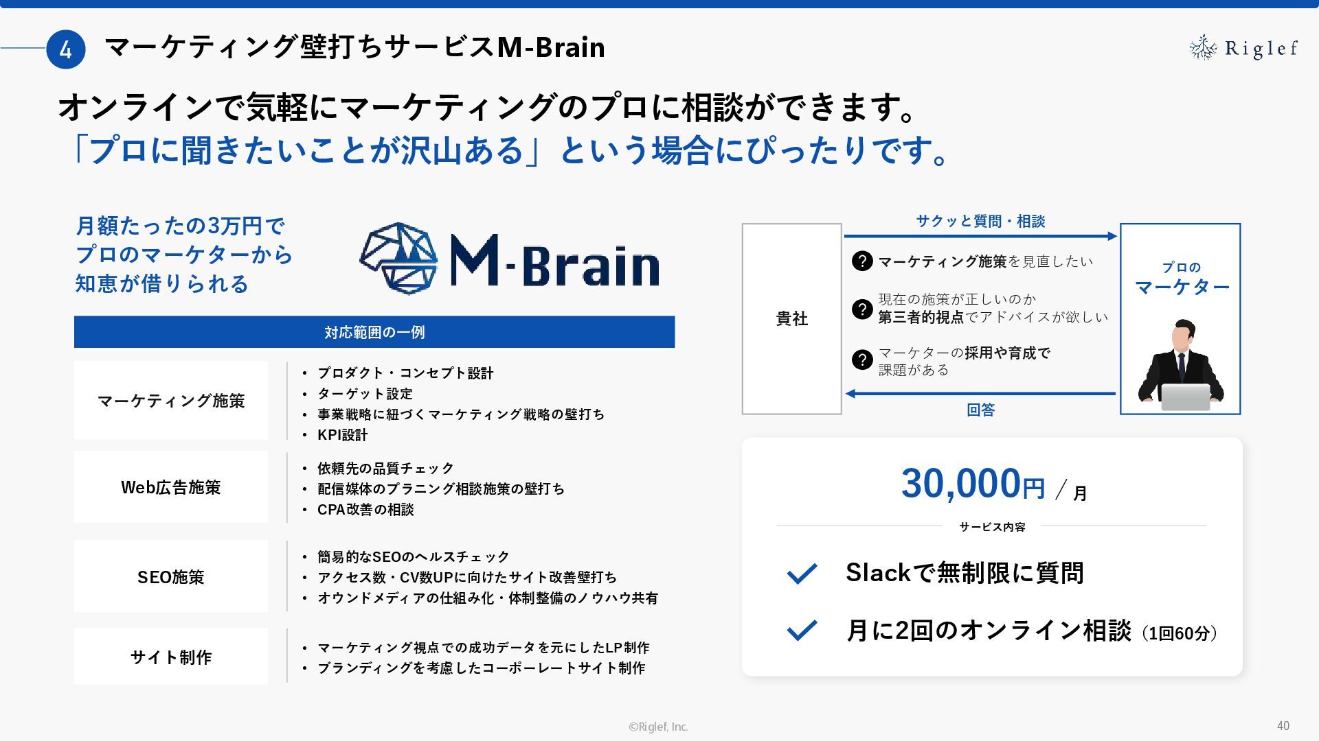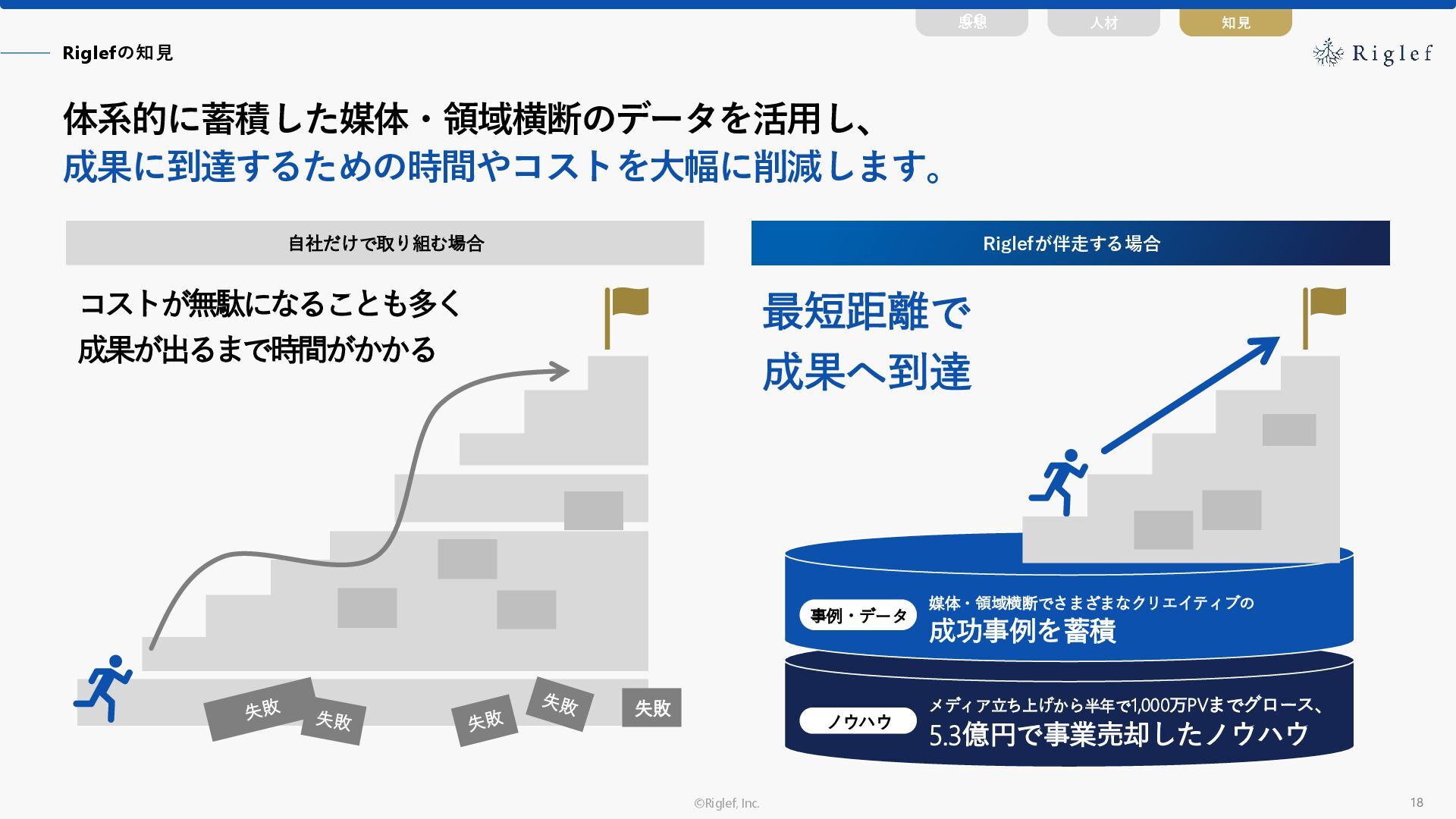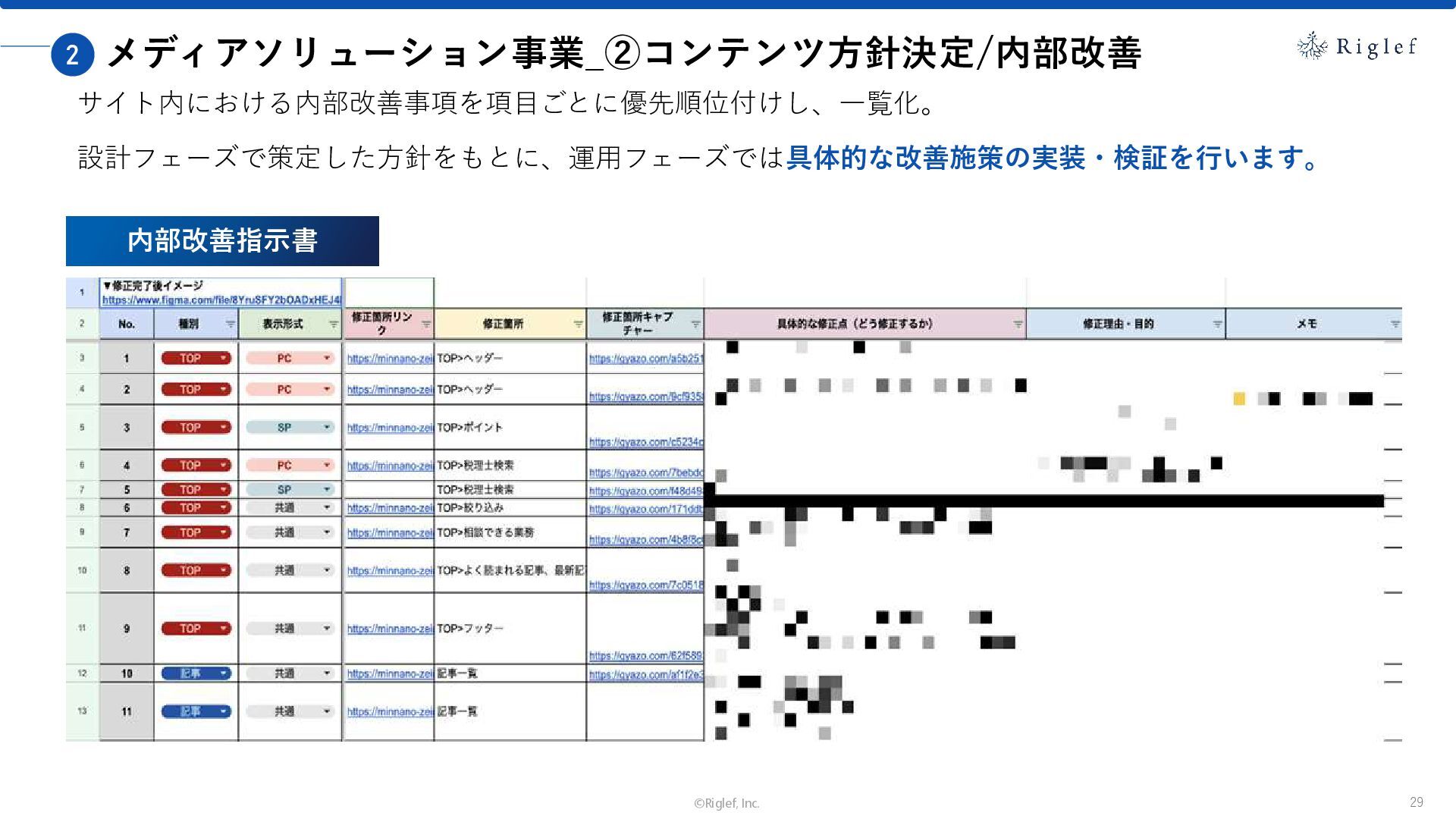果 背景 課題解決の ポイント 業種 サービス 金融 M&A仲介 Webマーケティングを担当できる人材がいなかった。 結果、クライアントにとって以下が喫緊の課題であった。 1. 獲得単価が平均よりも高額であること 2. 問い合わせ数がKPIに対して少ないこと ユーザーのインサイト分析に 注力した設計へ 予算 1,400万円 施策 CPA(1ヶ月半) 40,000円 50%改善 20,000円 CPA(半年間後) 20,000円 90%改善 4,300円 広告予算 550万円 850万UP 1,400万円 CPA改善 90%達成 ¥20,000 ¥4,300 ¥0 ¥20,000 ¥40,000 元々 1ヶ月 6ヶ月 期間 CPA 50%改善 90%改善 CPA価格改善の推移 使用した広告種類 1. サービスの対象となるユーザー像を深掘りし、面談のキャンセルが 頻発する原因等を分析。 2. 仮説をもとに構成を組み直したうえで、インサイトに刺さるようLP を設計。