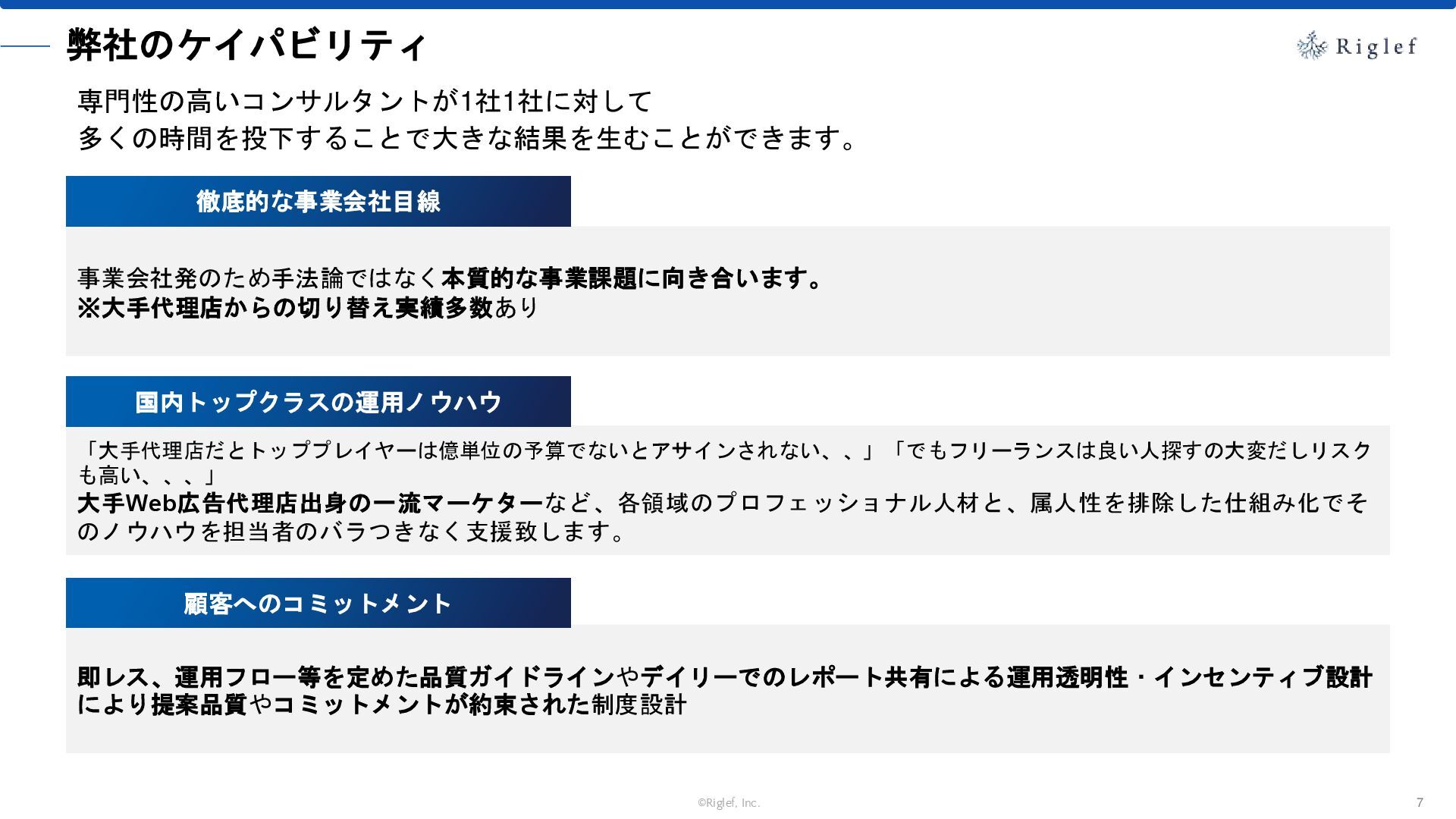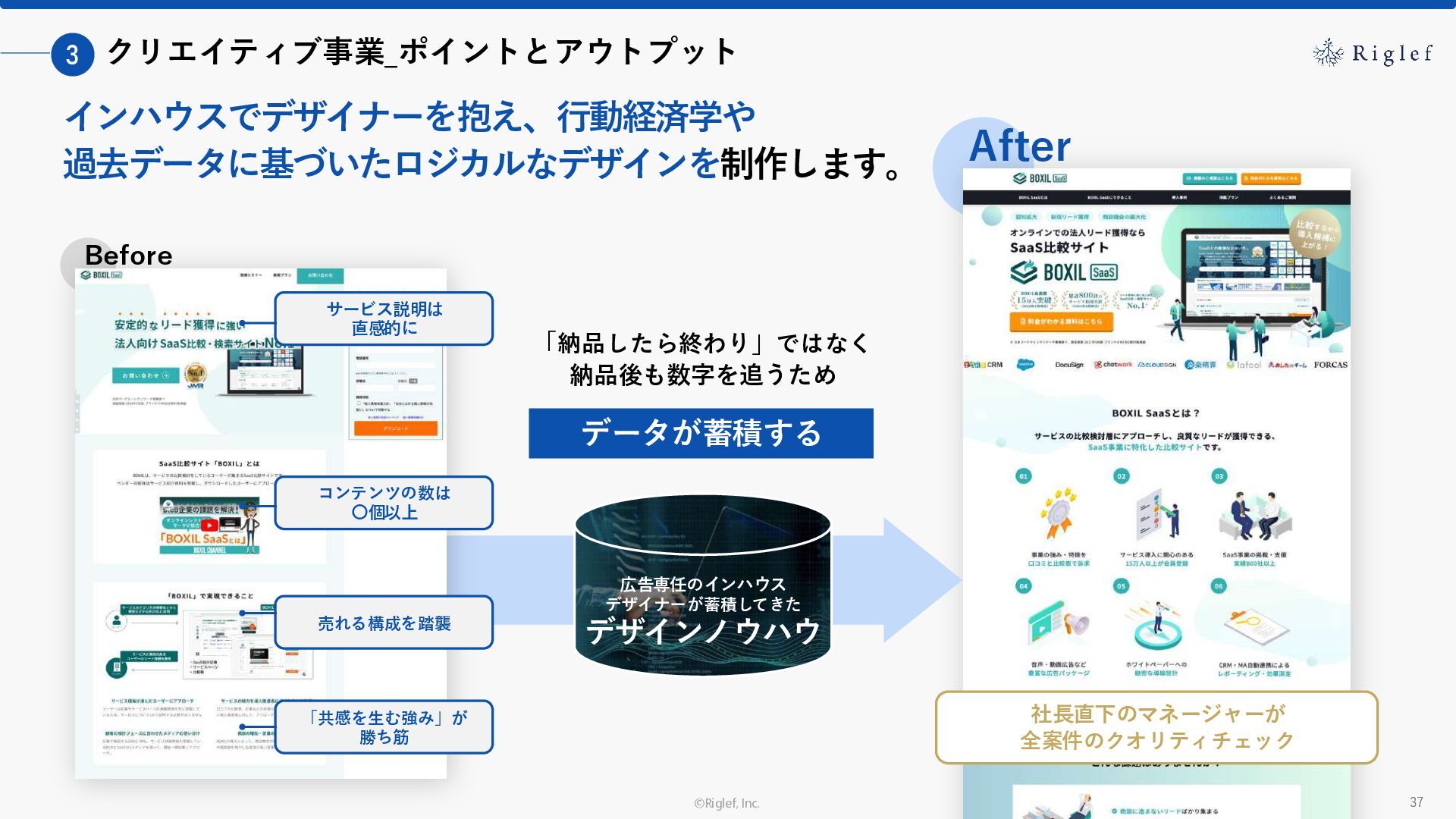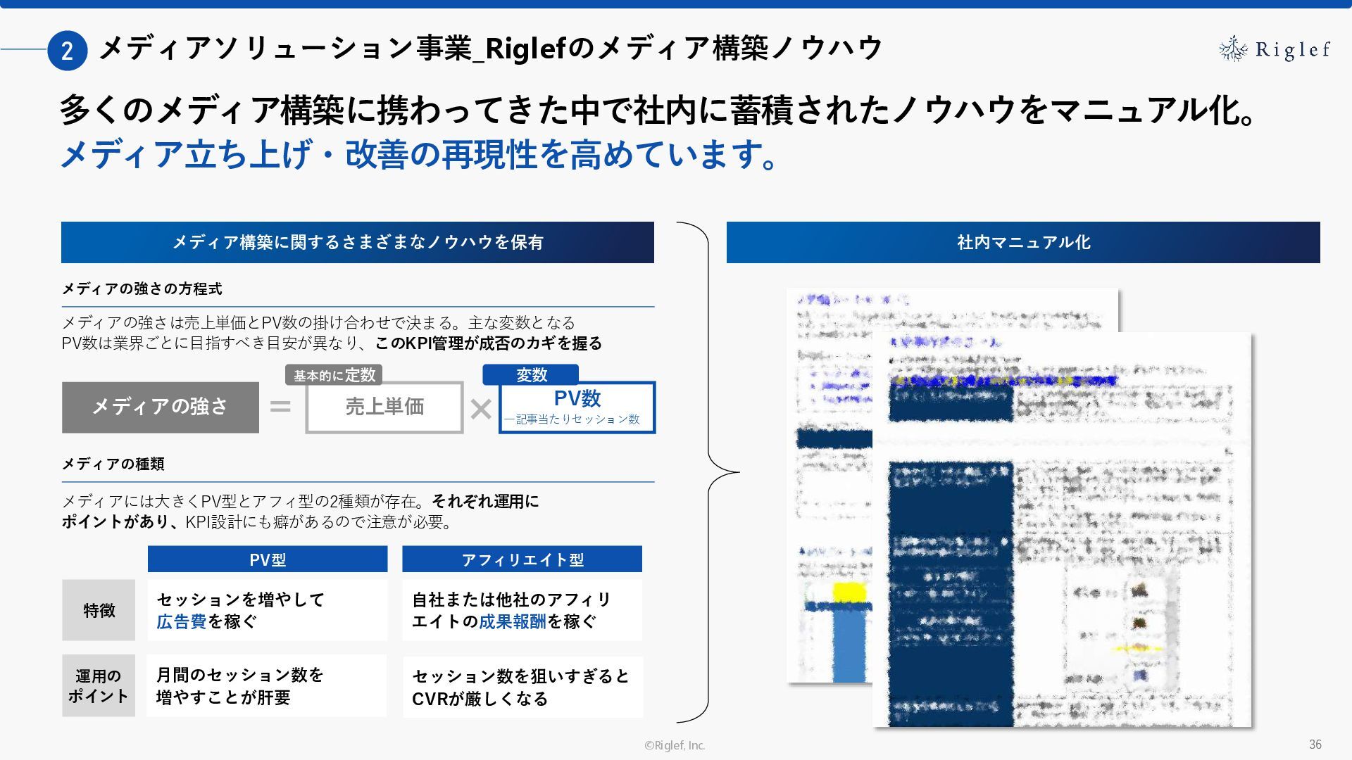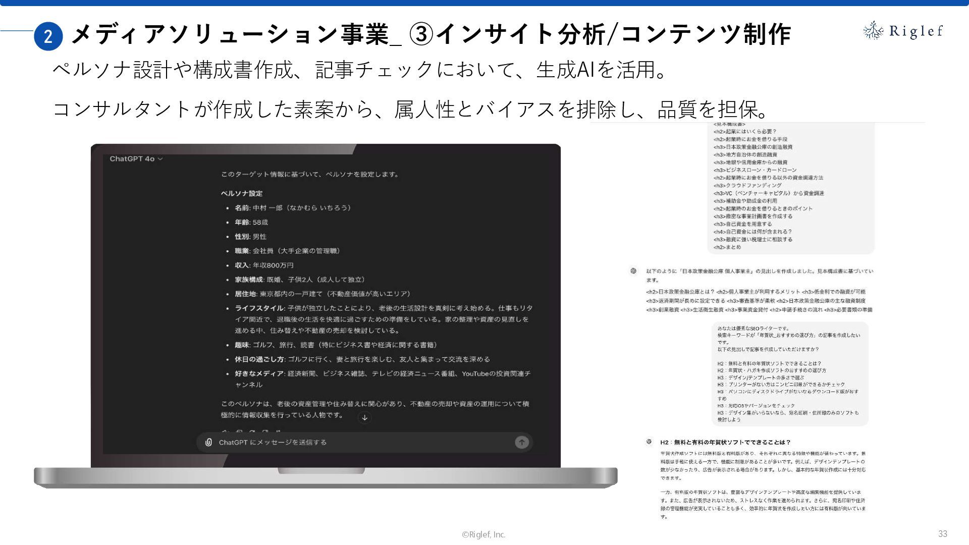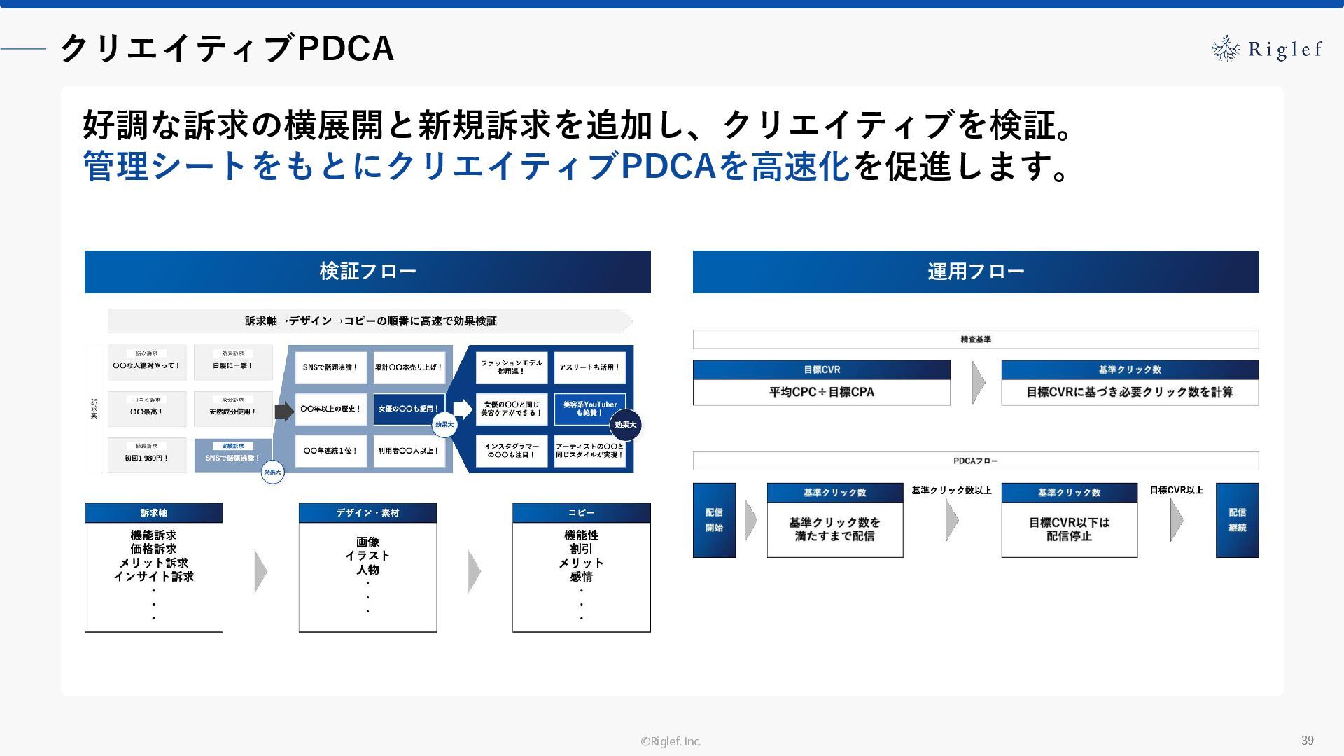 果 背景 課題解決の ポイント 業種 サービス 金融 M&A仲介 Webマーケティングを担当できる人材がいなかった。 結果、クライアントにとって以下が喫緊の課題であった。 1. 獲得単価が平均よりも高額であること 2. 問い合わせ数がKPIに対して少ないこと ユーザーのインサイト分析に 注力した設計へ 予算 1,400万円 施策 CPA(1ヶ月半) 40,000円 50%改善 20,000円 CPA(半年間後) 20,000円 90%改善 4,300円 広告予算 550万円 850万UP 1,400万円 CPA改善 90%達成 ¥20,000 ¥4,300 ¥0 ¥20,000 ¥40,000 元々 1ヶ月 6ヶ月 期間 CPA 50%改善 90%改善 CPA価格改善の推移 使用した広告種類 1. サービスの対象となるユーザー像を深掘りし、面談のキャンセルが 頻発する原因等を分析。 2. 仮説をもとに構成を組み直したうえで、インサイトに刺さるようLP を設計。