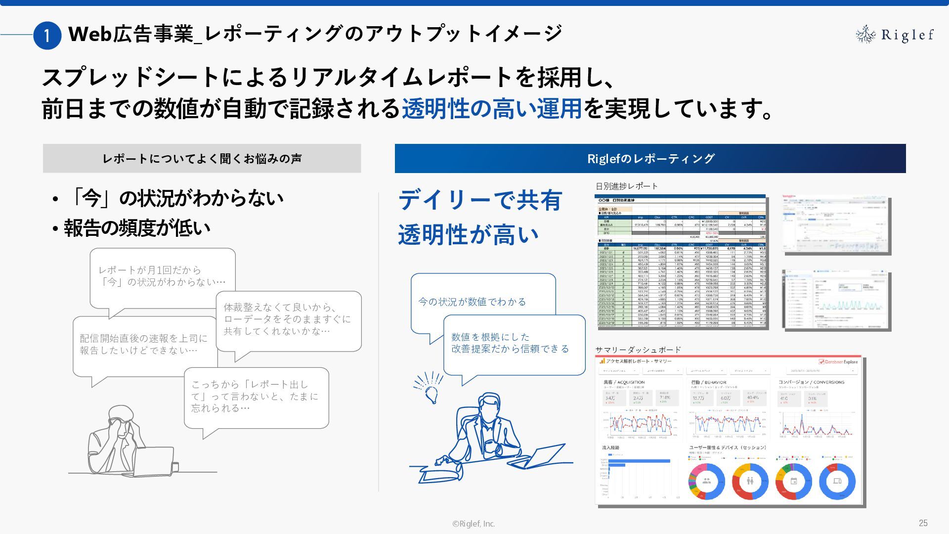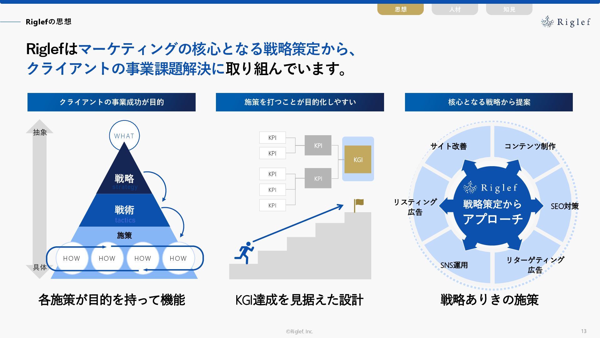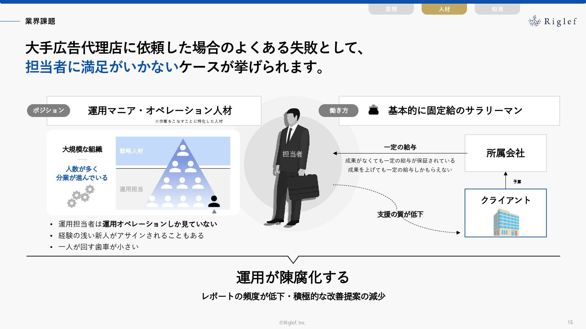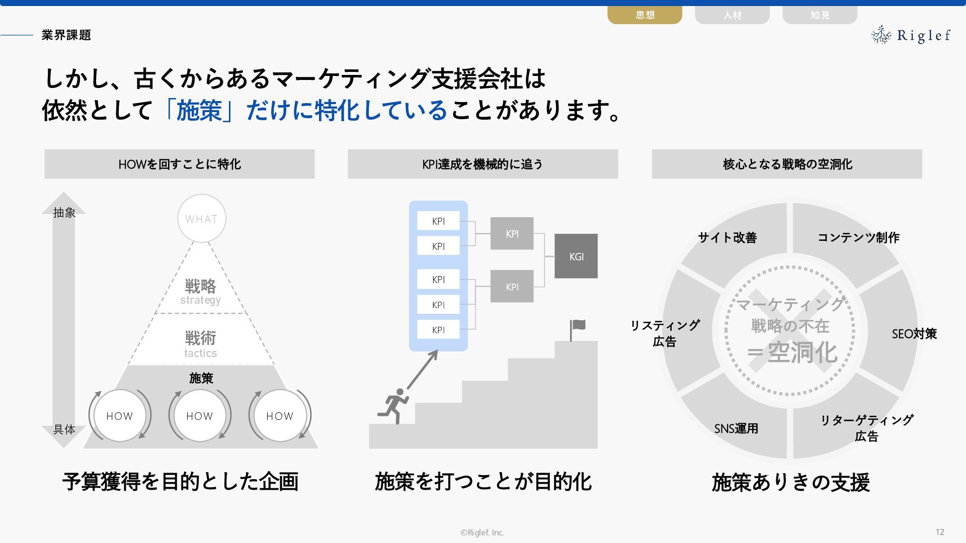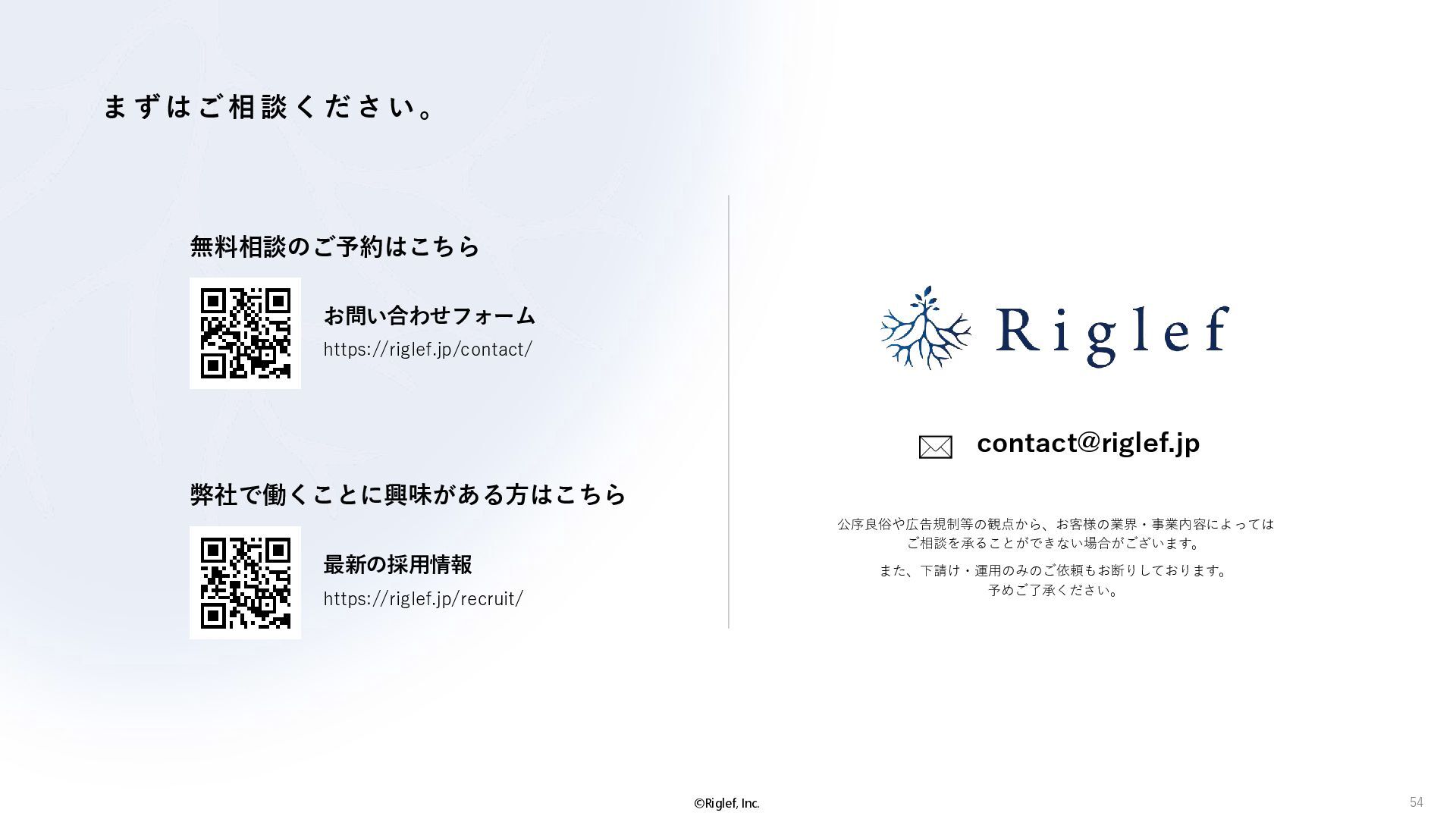 果 背景 課題解決の ポイント 業種 サービス 金融 M&A仲介 Webマーケティングを担当できる人材がいなかった。 結果、クライアントにとって以下が喫緊の課題であった。 1. 獲得単価が平均よりも高額であること 2. 問い合わせ数がKPIに対して少ないこと ユーザーのインサイト分析に 注力した設計へ 予算 1,400万円 施策 CPA(1ヶ月半) 40,000円 50%改善 20,000円 CPA(半年間後) 20,000円 90%改善 4,300円 広告予算 550万円 850万UP 1,400万円 CPA改善 90%達成 ¥20,000 ¥4,300 ¥0 ¥20,000 ¥40,000 元々 1ヶ月 6ヶ月 期間 CPA 50%改善 90%改善 CPA価格改善の推移 使用した広告種類 1. サービスの対象となるユーザー像を深掘りし、面談のキャンセルが 頻発する原因等を分析。 2. 仮説をもとに構成を組み直したうえで、インサイトに刺さるようLP を設計。