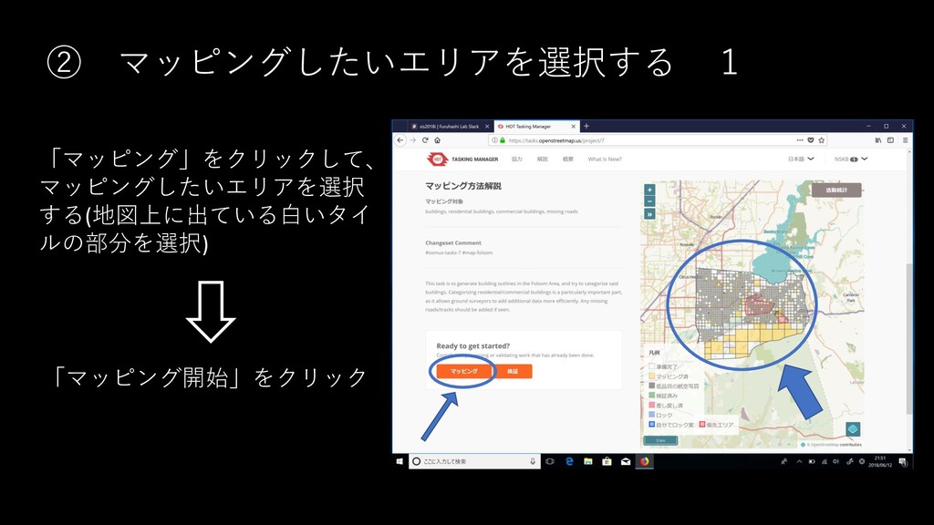 ② マッピングしたいエリアを選択する 1 「マッピング」をクリックして、 マッピングしたいエリアを選択 する(地図上に出ている白いタイ ルの部分を選択) 「マッピング開始」をクリック