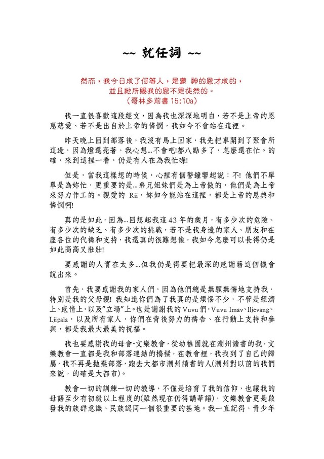 昨天晚上回到部落後,我沒有馬上回家,我先把車開到了聚會所 這邊,因為燈還亮著,我心想…不會吧!都八點多了,怎麼還在忙。的 確,來到這裡一看,仍是有人在為我忙碌! 但是,當我這樣想的時候,心裡有個警鐘響起說:不! 他們不單 單是為妳忙,更重要的是…弟兄姐妹們是為上帝做的,他們是為上帝 來努力作工的。親愛的 Rii,妳如今能站在這裡,都是上帝的恩典和 憐憫啊! 真的是如此,因為…回想起我這 43 年的歲月,有多少次的危險、 有多少次的缺乏、有多少次的挑戰,若不是我身邊的家人、朋友和在 座各位的代禱和支持,我還真的很難想像,我如今怎麼可以長得仍是 如此高高又壯壯! 要感謝的人實在太多…但我仍是得要把最深的感謝藉這個機會 說出來。 首先,我要感謝我的家人們,因為他們總是無願無悔地支持我, 特別是我的父母親! 我知道你們為了我真的是煩惱不少,不管是經濟 上 、 感情上 , 以及”立場”上 。 也是謝謝我的 Vuvu 們 , Vuvu Imav 、 Iljevang 、 Ljipala,以及所有家人,你們在背後努力的禱告、在行動上支持和參 與,都是我最大最美的祝福。 我也要感謝我的母會-文樂教會,從幼稚園就在潮州讀書的我,文 樂教會一直都是我和部落連結的橋樑,在教會裡,我找到了自己的歸 屬,我不再是拋棄部落,跑去大都市潮州讀書的人(潮州對以前的我們 來說,的確是大都市)。 教會一切的訓練一切的教導,不僅是培育了我的信仰,也讓我的 母語至少有初級以上程度的(雖然現在仍得講華語),文樂教會更是啟 發我的族群意識、民族認同一個很重要的基地。我一直記得,青少年
