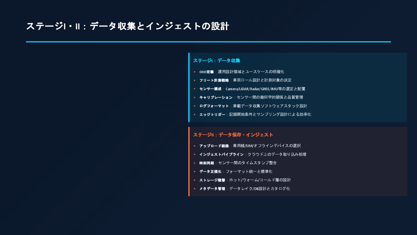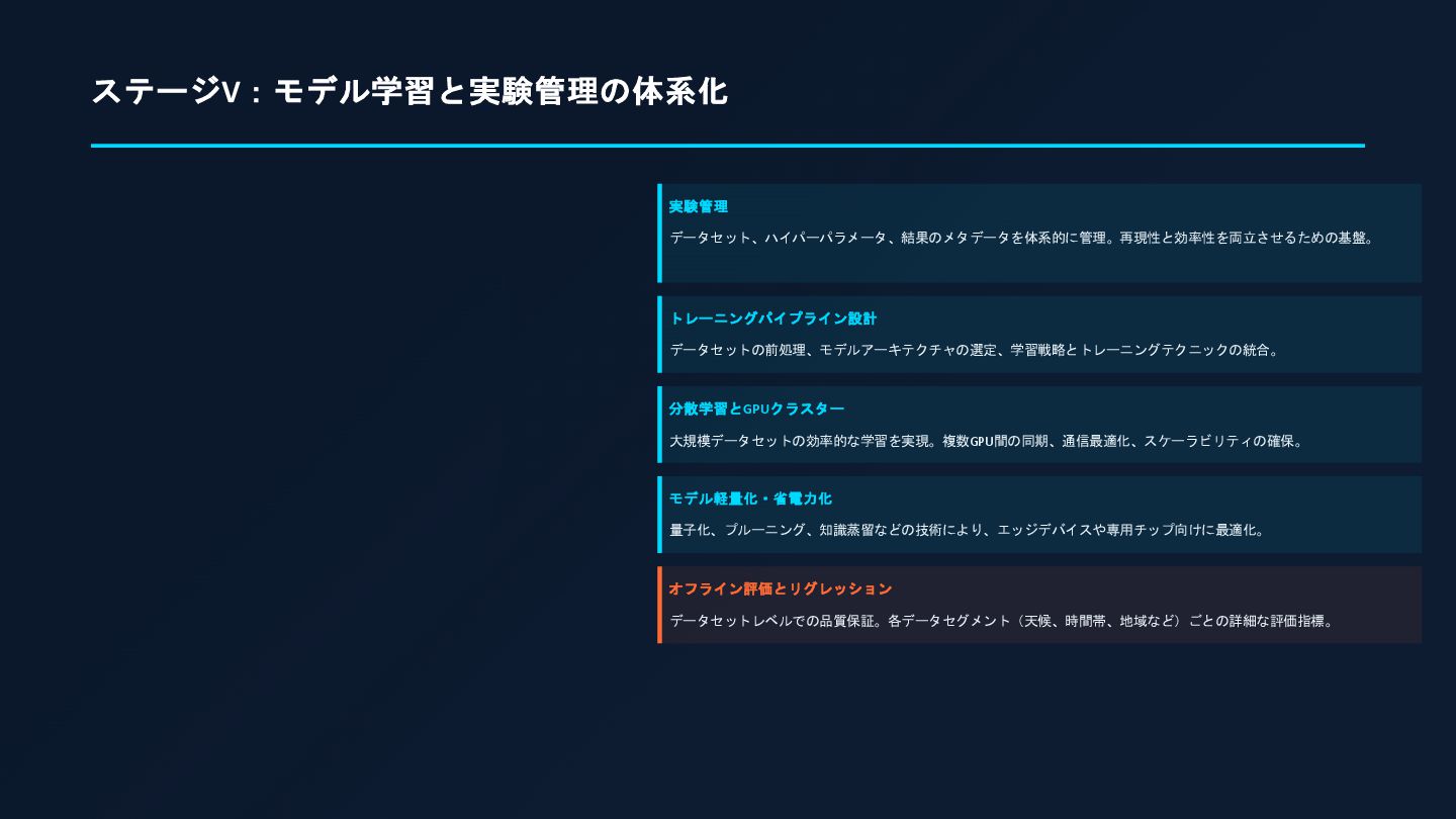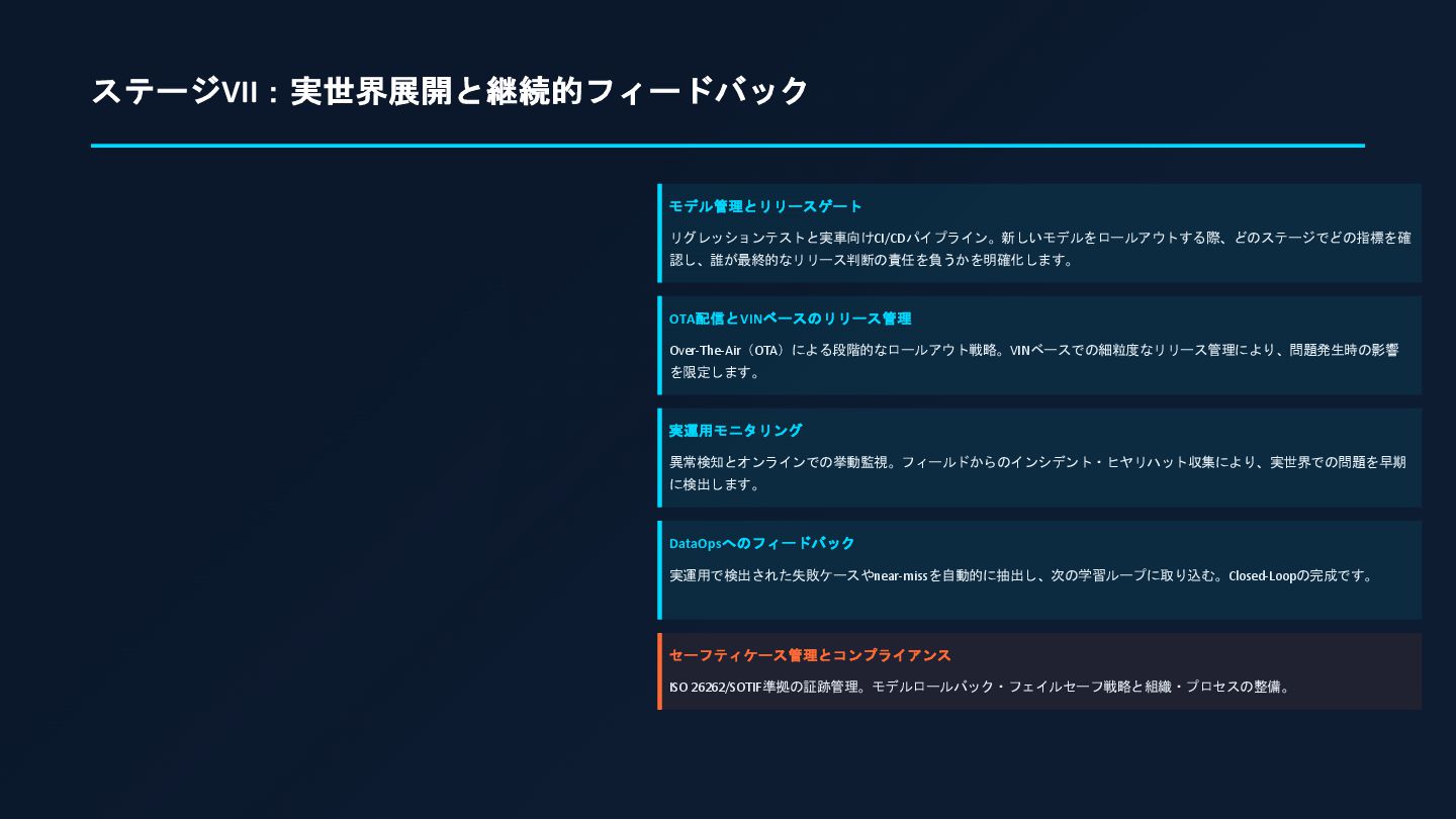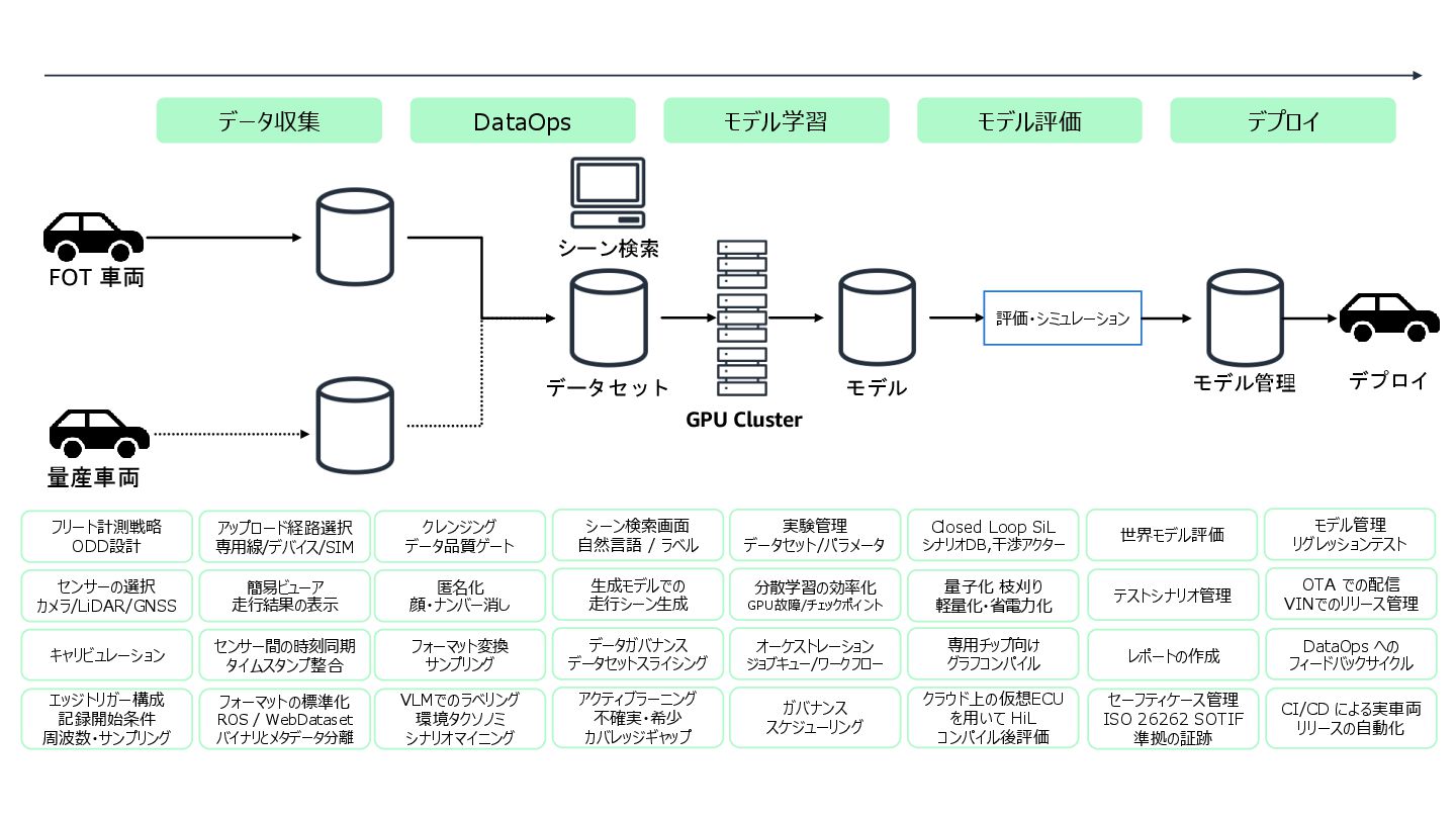 データセット シーン検索 モデル 評価・シミュレーション モデル管理 デプロイ フリート計測戦略 ODD設計 センサーの選択 カメラ/LiDAR/GNSS キャリビュレーション エッジトリガー構成 記録開始条件 周波数・サンプリング フォーマットの標準化 ROS / WebDataset バイナリとメタデータ分離 センサー間の時刻同期 タイムスタンプ整合 簡易ビューア ⾛⾏結果の表⽰ アップロード経路選択 専⽤線/デバイス/SIM VLMでのラベリング 環境タクソノミ シナリオマイニング フォーマット変換 サンプリング 匿名化 顔・ナンバー消し クレンジング データ品質ゲート アクティブラーニング 不確実・希少 カバレッジギャップ データガバナンス データセットスライシング ⽣成モデルでの ⾛⾏シーン⽣成 シーン検索画⾯ ⾃然⾔語 / ラベル ガバナンス スケジューリング オーケストレーション ジョブキュー/ワークフロー 分散学習の効率化 GPU故障/チェックポイント 実験管理 データセット/パラメータ Closed Loop SiL シナリオDB,⼲渉アクター 量⼦化 枝刈り 軽量化・省電⼒化 世界モデル評価 テストシナリオ管理 クラウド上の仮想ECU を⽤いて HiL コンパイル後評価 専⽤チップ向け グラフコンパイル セーフティケース管理 ISO 26262 SOTIF 準拠の証跡 レポートの作成 モデル管理 リグレッションテスト OTA での配信 VINでのリリース管理 CI/CD による実⾞両 リリースの⾃動化 DataOps への フィードバックサイクル