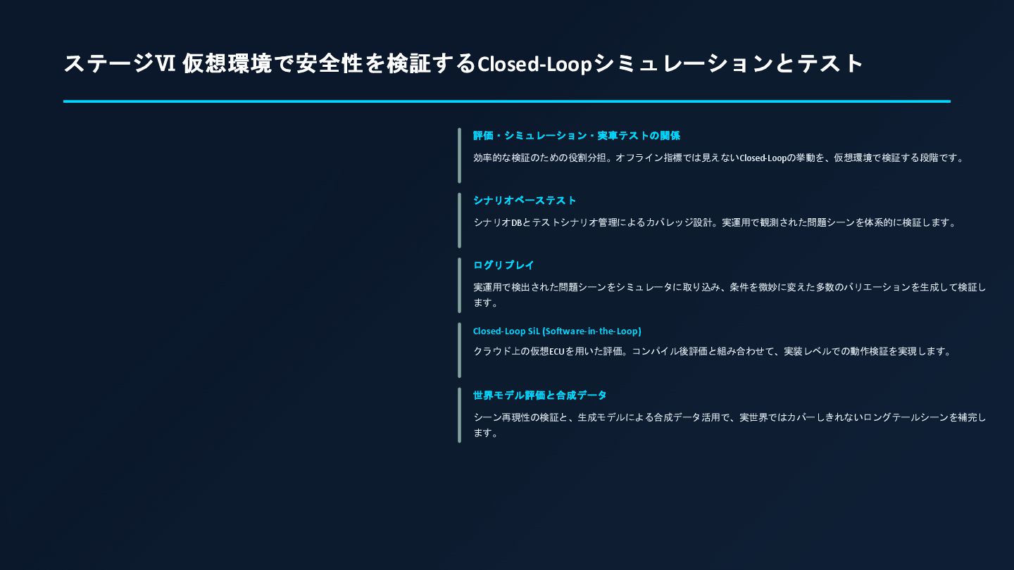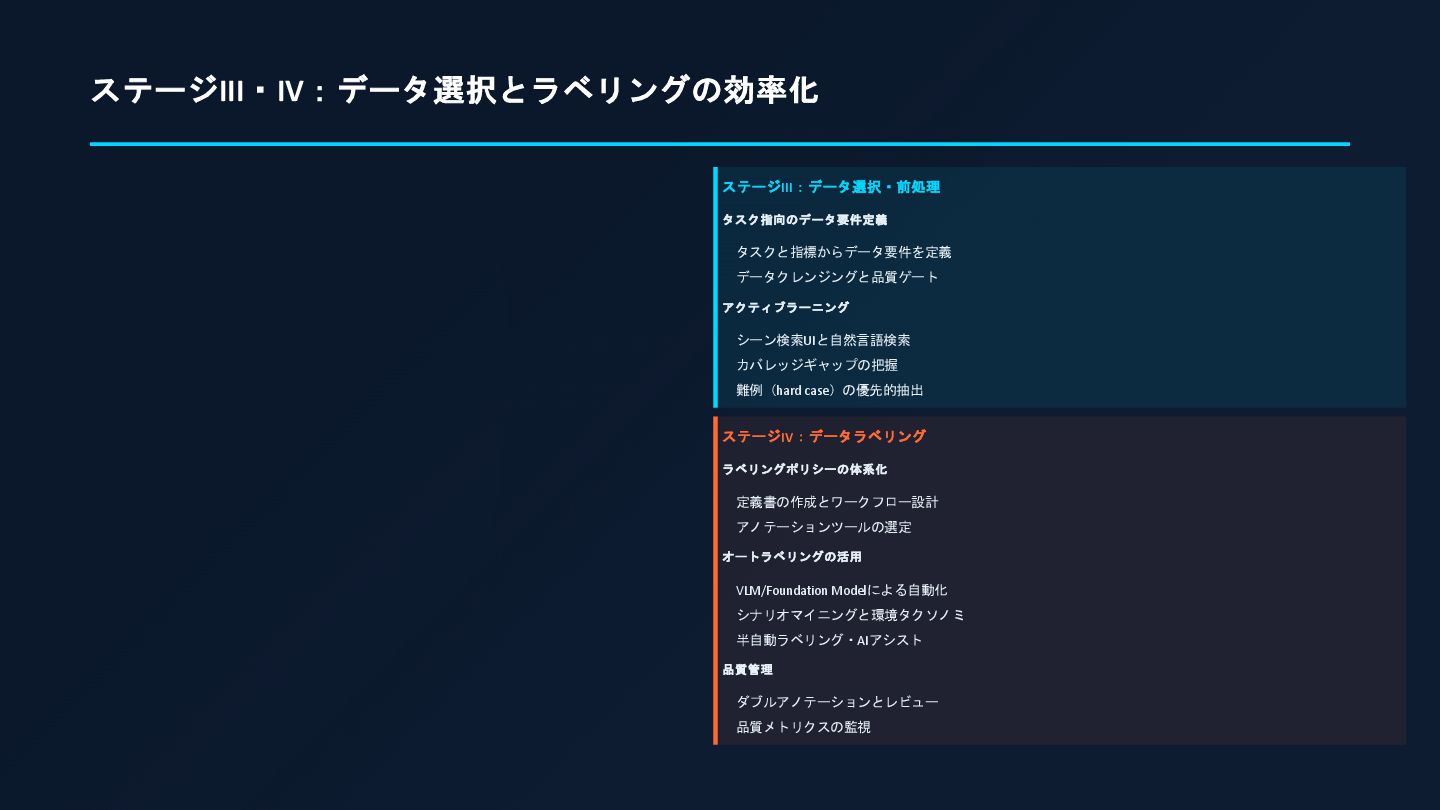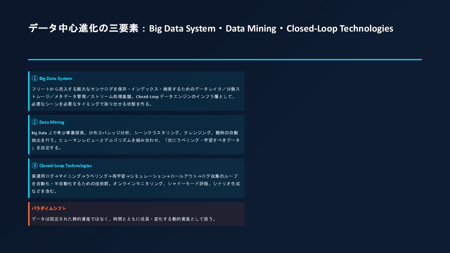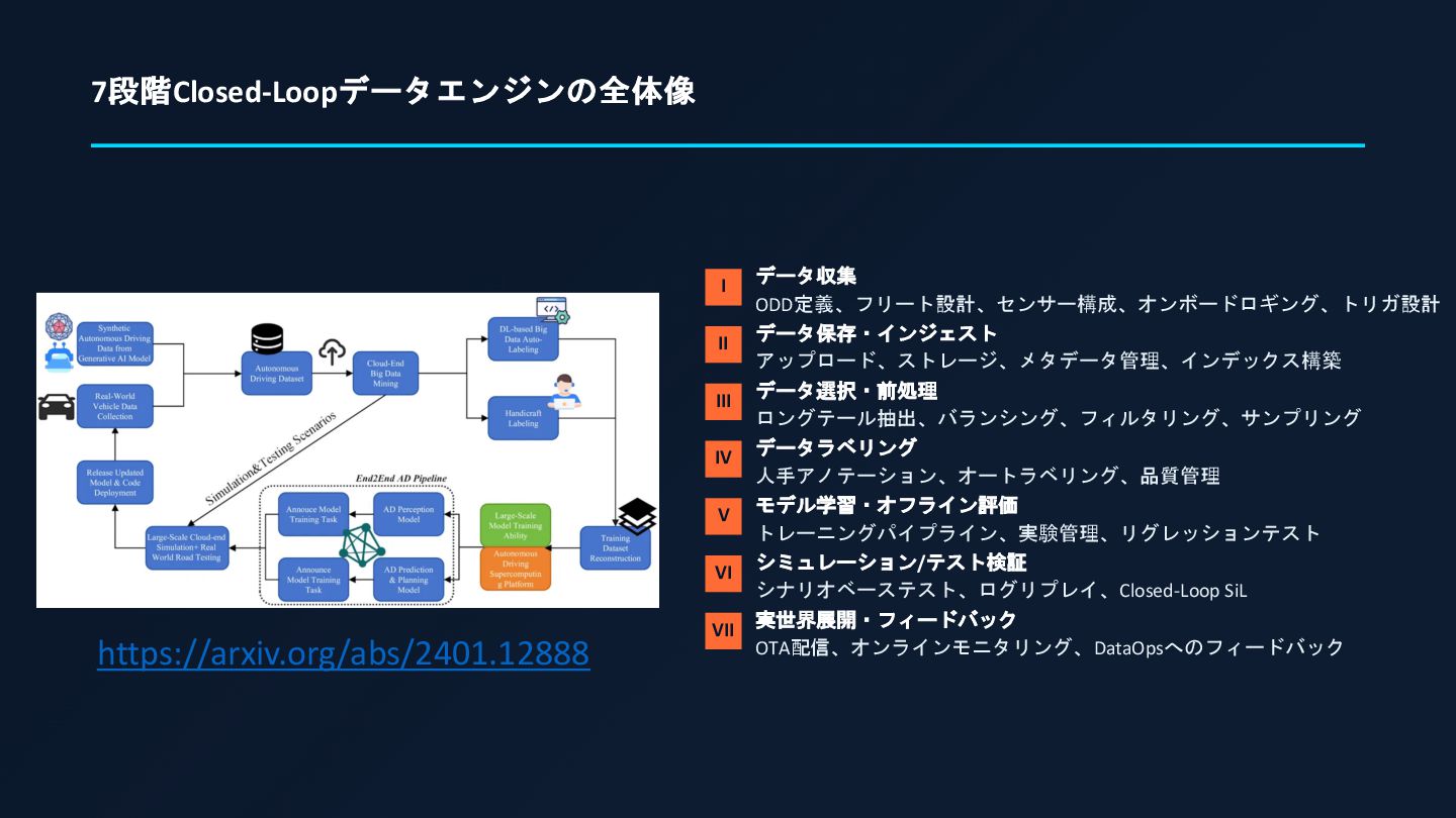 データセット シーン検索 モデル 評価・シミュレーション モデル管理 デプロイ フリート計測戦略 ODD設計 センサーの選択 カメラ/LiDAR/GNSS キャリビュレーション エッジトリガー構成 記録開始条件 周波数・サンプリング フォーマットの標準化 ROS / WebDataset バイナリとメタデータ分離 センサー間の時刻同期 タイムスタンプ整合 簡易ビューア ⾛⾏結果の表⽰ アップロード経路選択 専⽤線/デバイス/SIM VLMでのラベリング 環境タクソノミ シナリオマイニング フォーマット変換 サンプリング 匿名化 顔・ナンバー消し クレンジング データ品質ゲート アクティブラーニング 不確実・希少 カバレッジギャップ データガバナンス データセットスライシング ⽣成モデルでの ⾛⾏シーン⽣成 シーン検索画⾯ ⾃然⾔語 / ラベル ガバナンス スケジューリング オーケストレーション ジョブキュー/ワークフロー 分散学習の効率化 GPU故障/チェックポイント 実験管理 データセット/パラメータ Closed Loop SiL シナリオDB,⼲渉アクター 量⼦化 枝刈り 軽量化・省電⼒化 世界モデル評価 テストシナリオ管理 クラウド上の仮想ECU を⽤いて HiL コンパイル後評価 専⽤チップ向け グラフコンパイル セーフティケース管理 ISO 26262 SOTIF 準拠の証跡 レポートの作成 モデル管理 リグレッションテスト OTA での配信 VINでのリリース管理 CI/CD による実⾞両 リリースの⾃動化 DataOps への フィードバックサイクル
