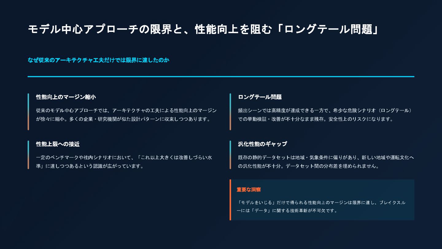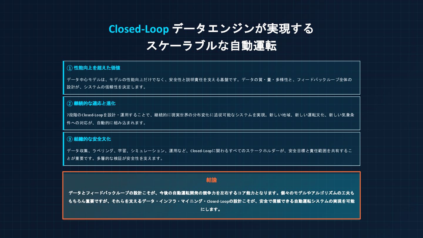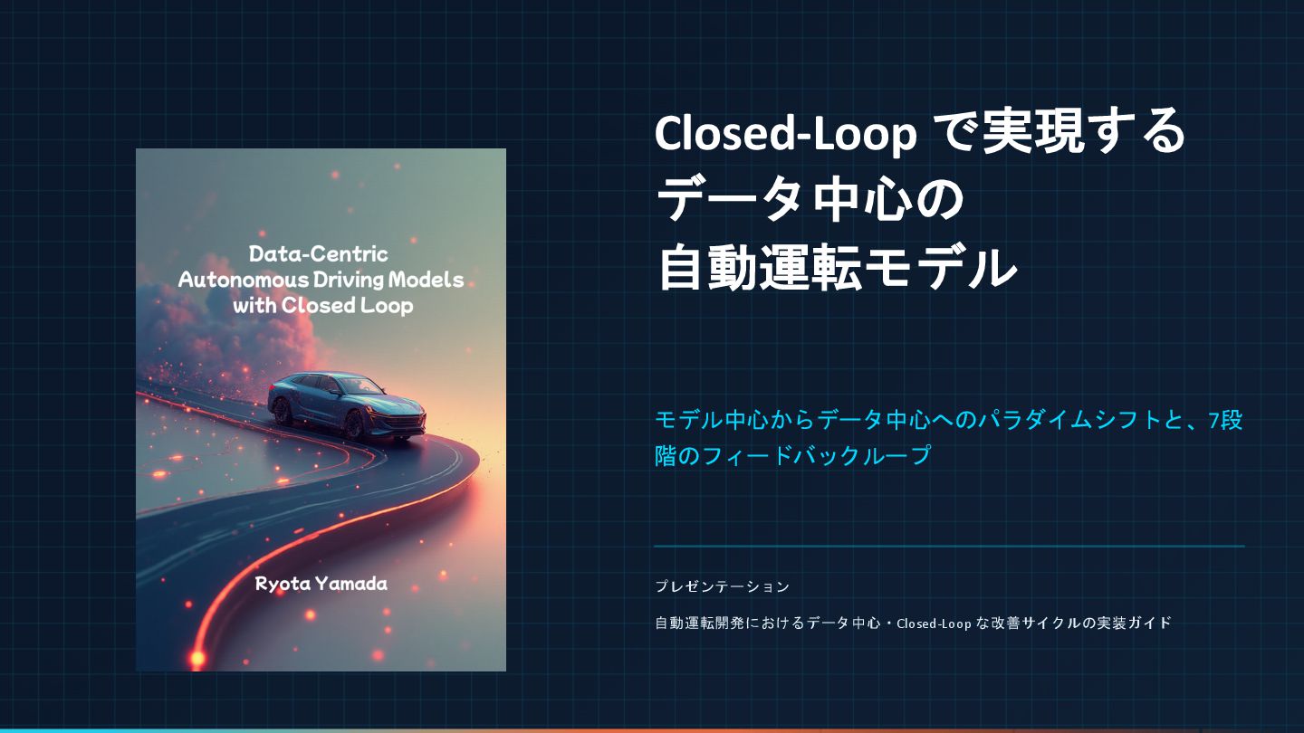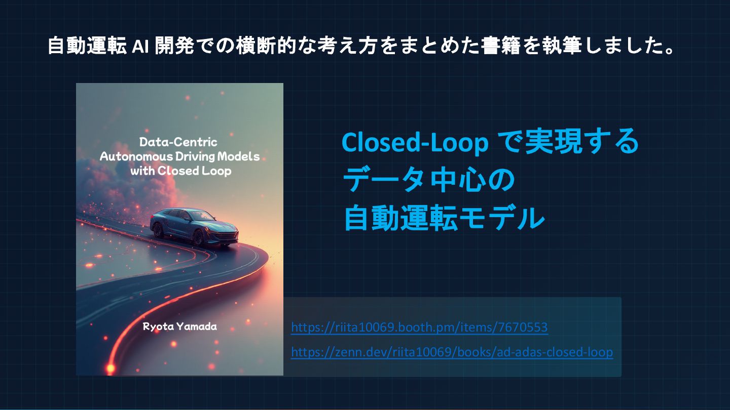 データセット シーン検索 モデル 評価・シミュレーション モデル管理 デプロイ フリート計測戦略 ODD設計 センサーの選択 カメラ/LiDAR/GNSS キャリビュレーション エッジトリガー構成 記録開始条件 周波数・サンプリング フォーマットの標準化 ROS / WebDataset バイナリとメタデータ分離 センサー間の時刻同期 タイムスタンプ整合 簡易ビューア ⾛⾏結果の表⽰ アップロード経路選択 専⽤線/デバイス/SIM VLMでのラベリング 環境タクソノミ シナリオマイニング フォーマット変換 サンプリング 匿名化 顔・ナンバー消し クレンジング データ品質ゲート アクティブラーニング 不確実・希少 カバレッジギャップ データガバナンス データセットスライシング ⽣成モデルでの ⾛⾏シーン⽣成 シーン検索画⾯ ⾃然⾔語 / ラベル ガバナンス スケジューリング オーケストレーション ジョブキュー/ワークフロー 分散学習の効率化 GPU故障/チェックポイント 実験管理 データセット/パラメータ Closed Loop SiL シナリオDB,⼲渉アクター 量⼦化 枝刈り 軽量化・省電⼒化 世界モデル評価 テストシナリオ管理 クラウド上の仮想ECU を⽤いて HiL コンパイル後評価 専⽤チップ向け グラフコンパイル セーフティケース管理 ISO 26262 SOTIF 準拠の証跡 レポートの作成 モデル管理 リグレッションテスト OTA での配信 VINでのリリース管理 CI/CD による実⾞両 リリースの⾃動化 DataOps への フィードバックサイクル