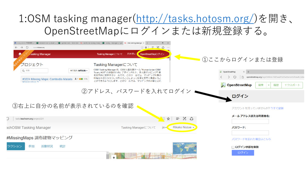 1:OSM tasking manager(http://tasks.hotosm.org/)を開き、 OpenStreetMapにログインまたは新規登録する。 ①ここからログインまたは登録 ②アドレス、パスワードを入れてログイン ③右上に自分の名前が表示されているのを確認