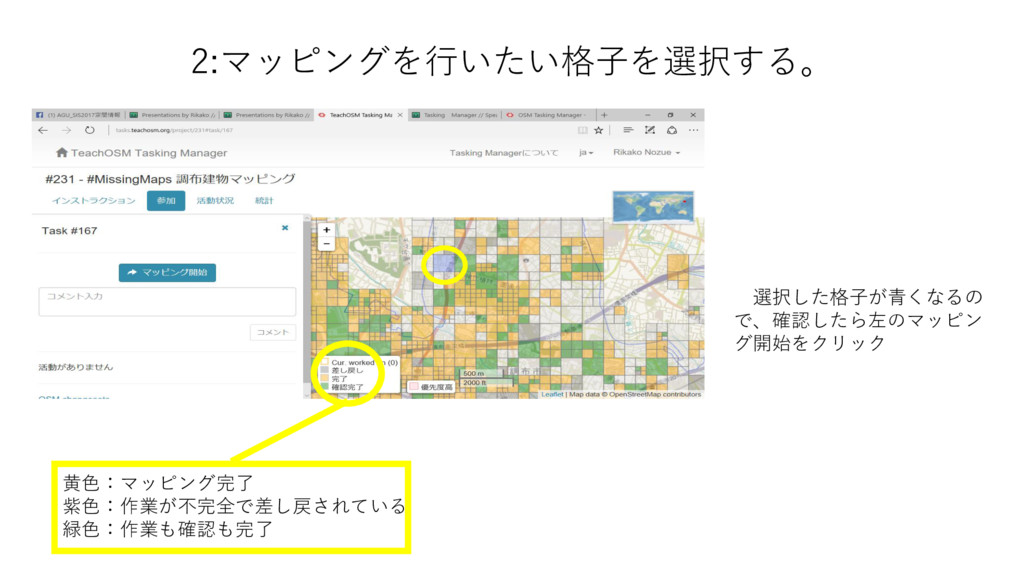 2:マッピングを行いたい格子を選択する。 黄色:マッピング完了 紫色:作業が不完全で差し戻されている 緑色:作業も確認も完了 選択した格子が青くなるの で、確認したら左のマッピン グ開始をクリック