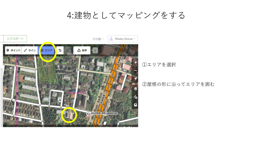4:建物としてマッピングをする ①エリアを選択 ②屋根の形に沿ってエリアを囲む