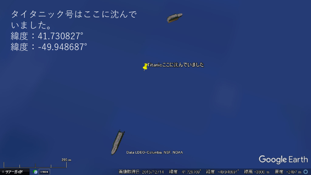 タイタニック号はここに沈んで いました。 緯度:41.730827° 緯度:-49.948687°