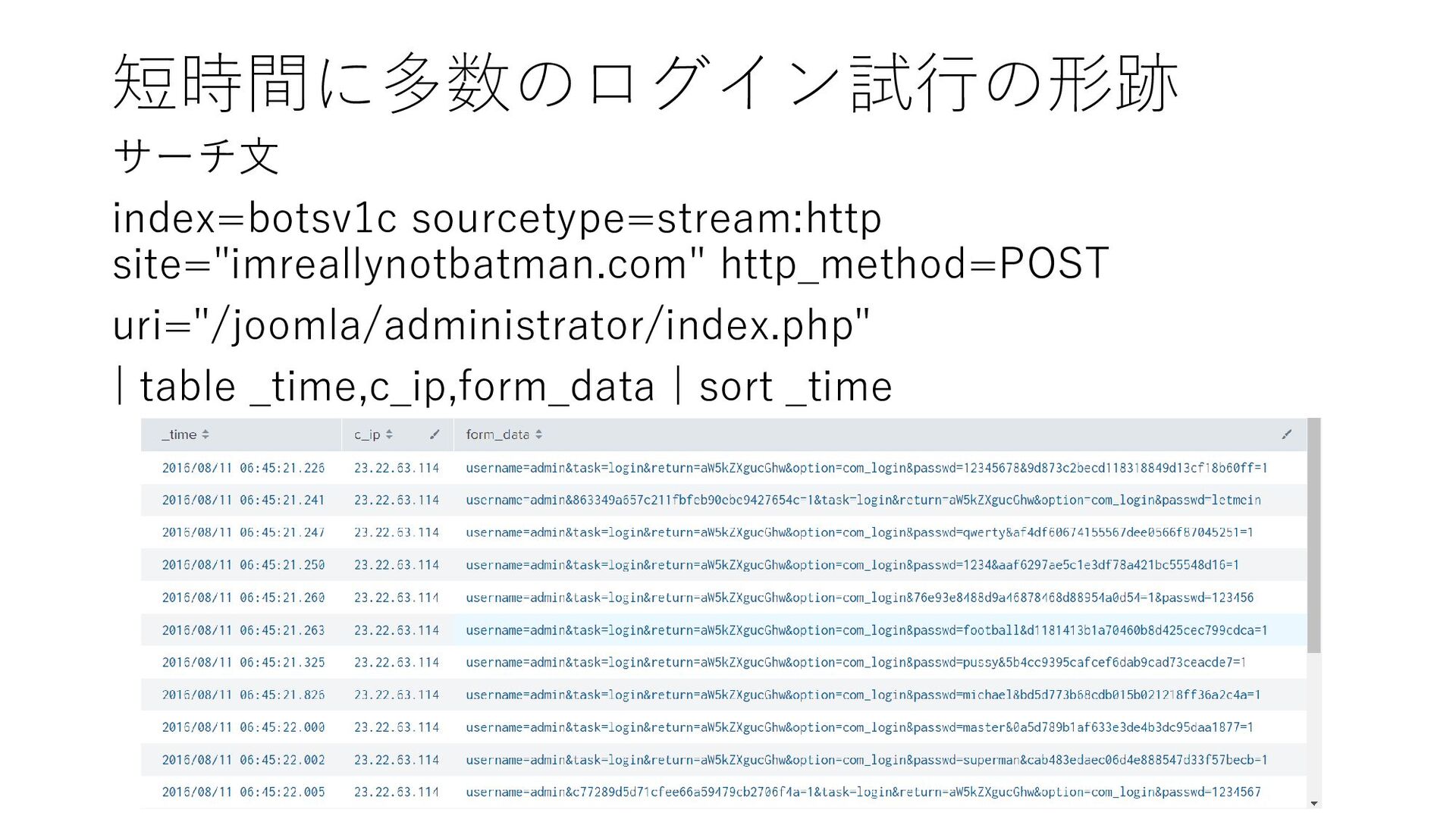ユーザーネームをadminで固定し、パスワードは毎回変更された通信が、ごく短い時間に多数あることがわかりました。