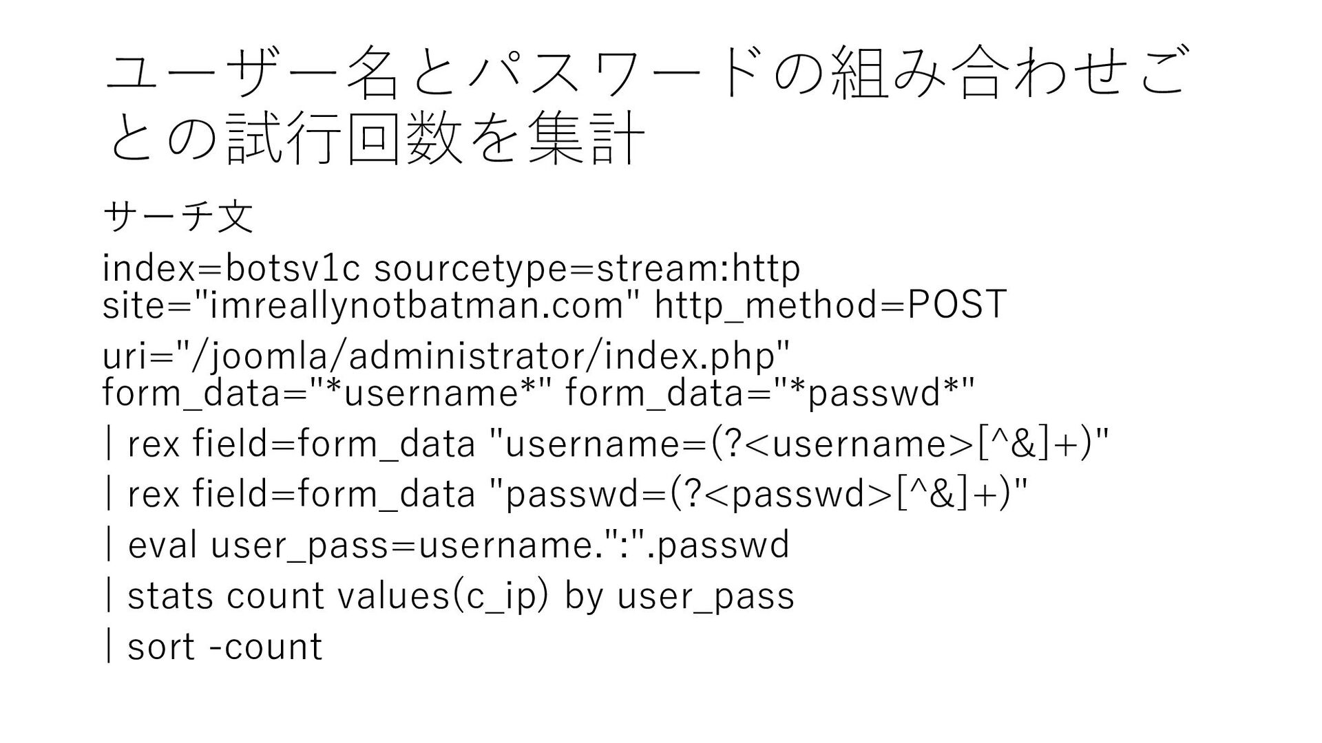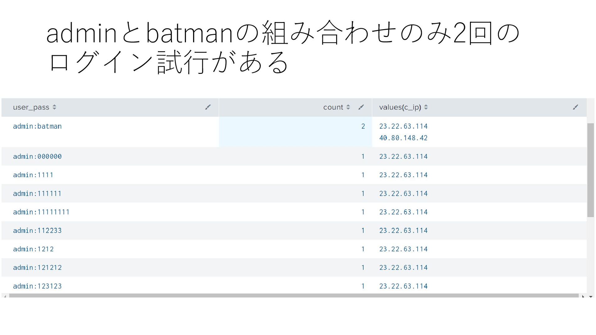 14. 結果を見てみるとadminとbatmanの組み合わせのみ2回のログイン試行があることがわかりました。