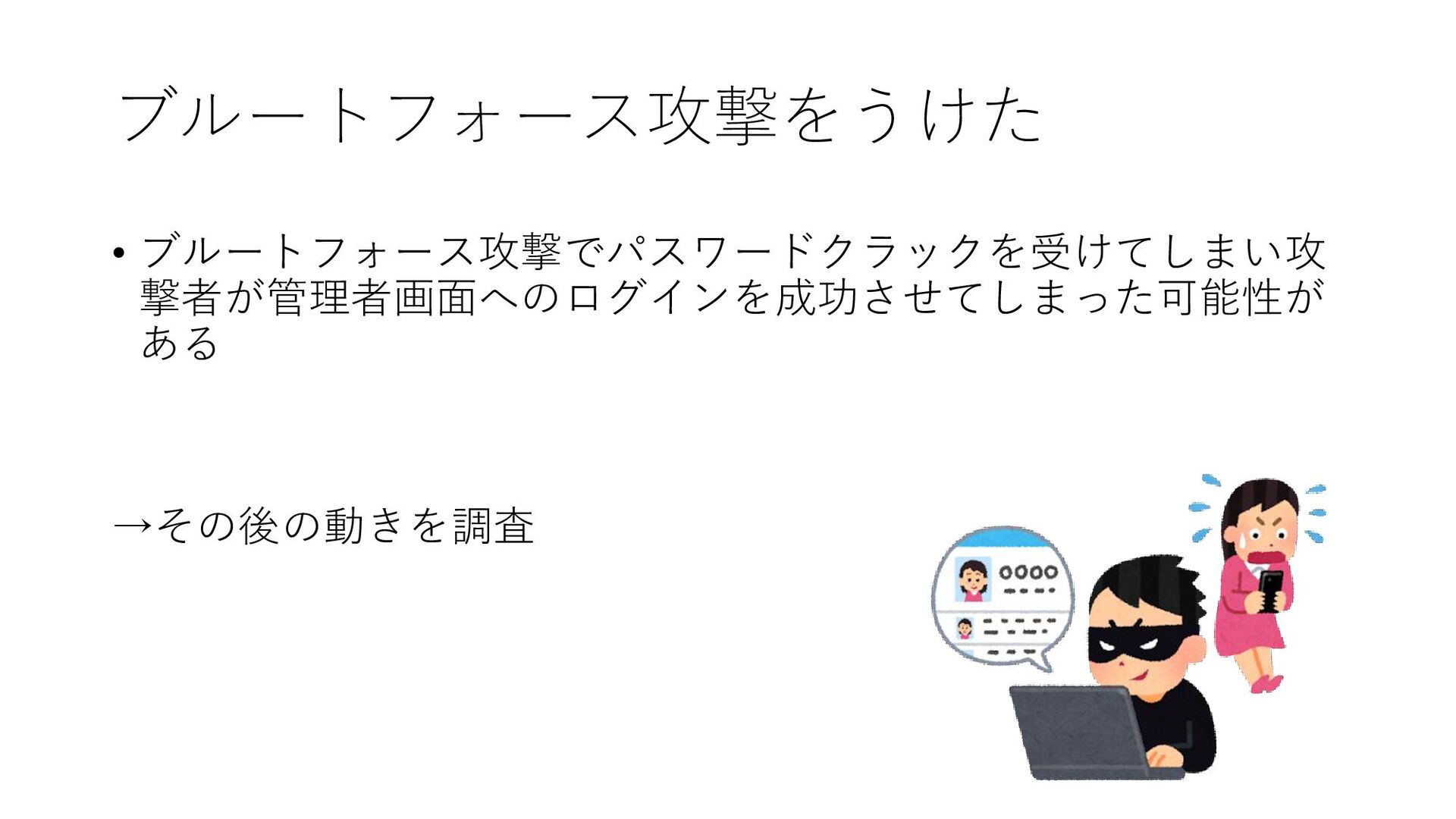 その内容を見てみると、攻撃者からブルートフォース攻撃を受けてパスワードが攻撃者に知られてしまい、