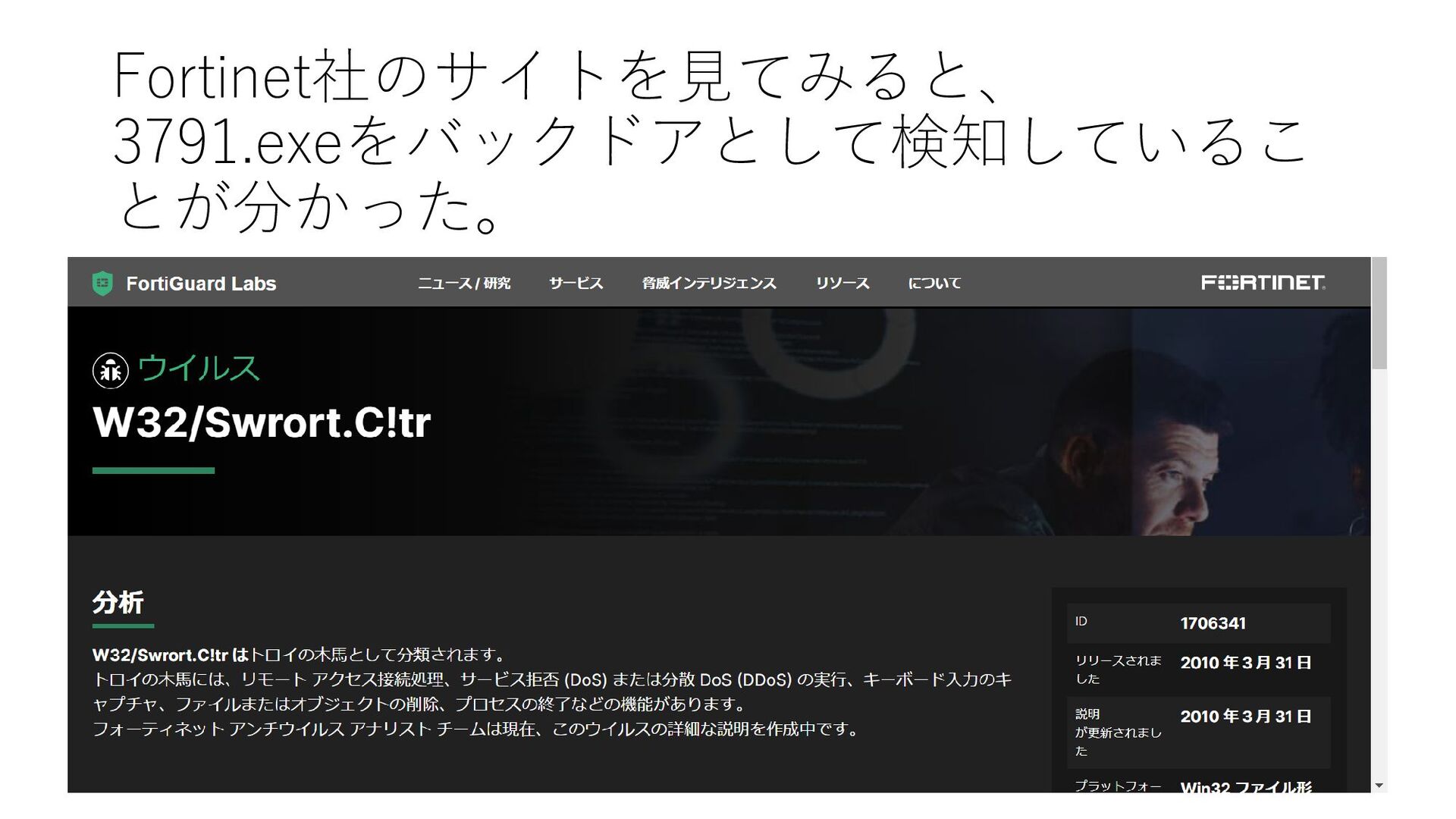 20. Fortinet社のサイトに情報がのっており、UTMからバックドアとして検知のされていることがわかりました。