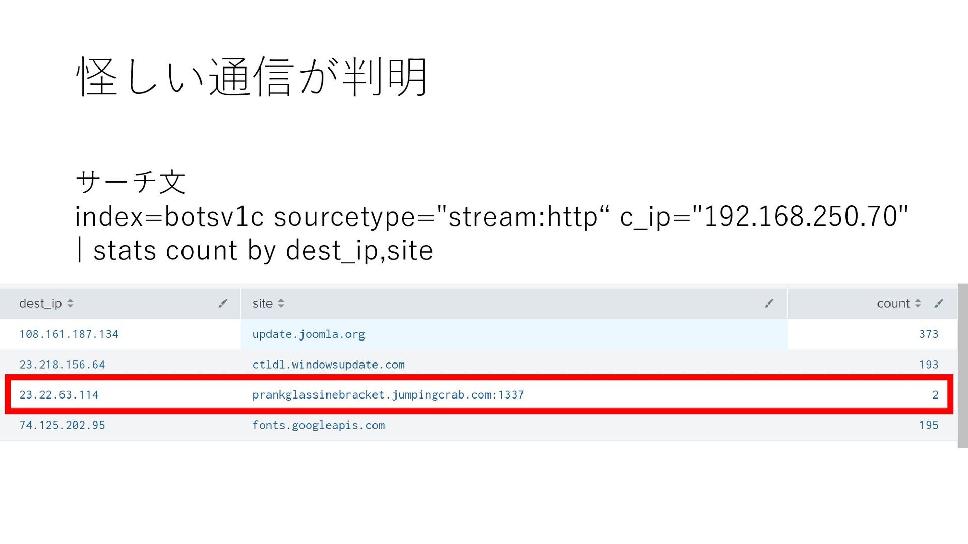 この4つの送信先IPアドレスのうちうちの一つのIPアドレスが先ほどブルートフォース攻撃を仕掛けてきたIPアドレスと一致していることが確認できました。