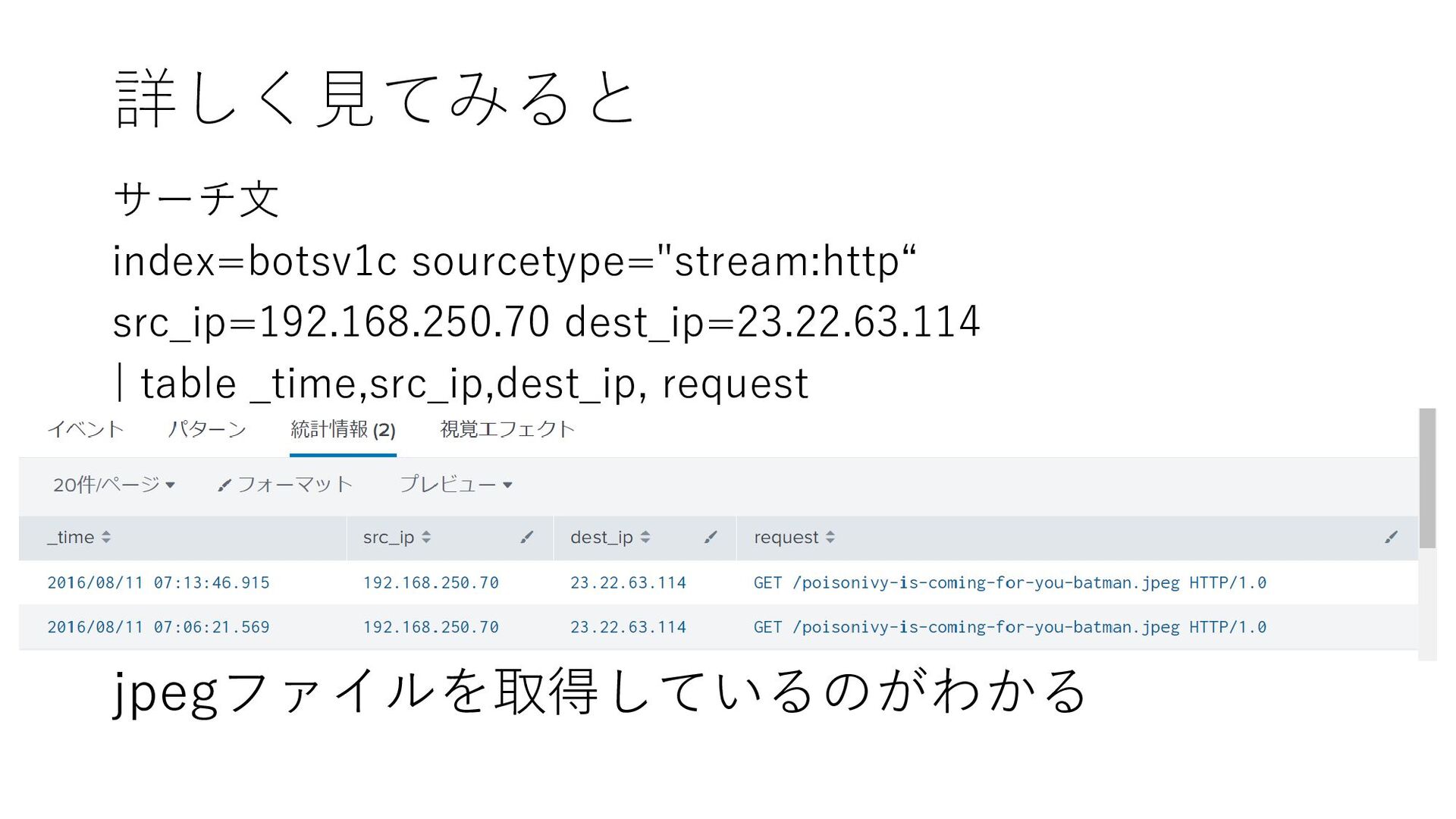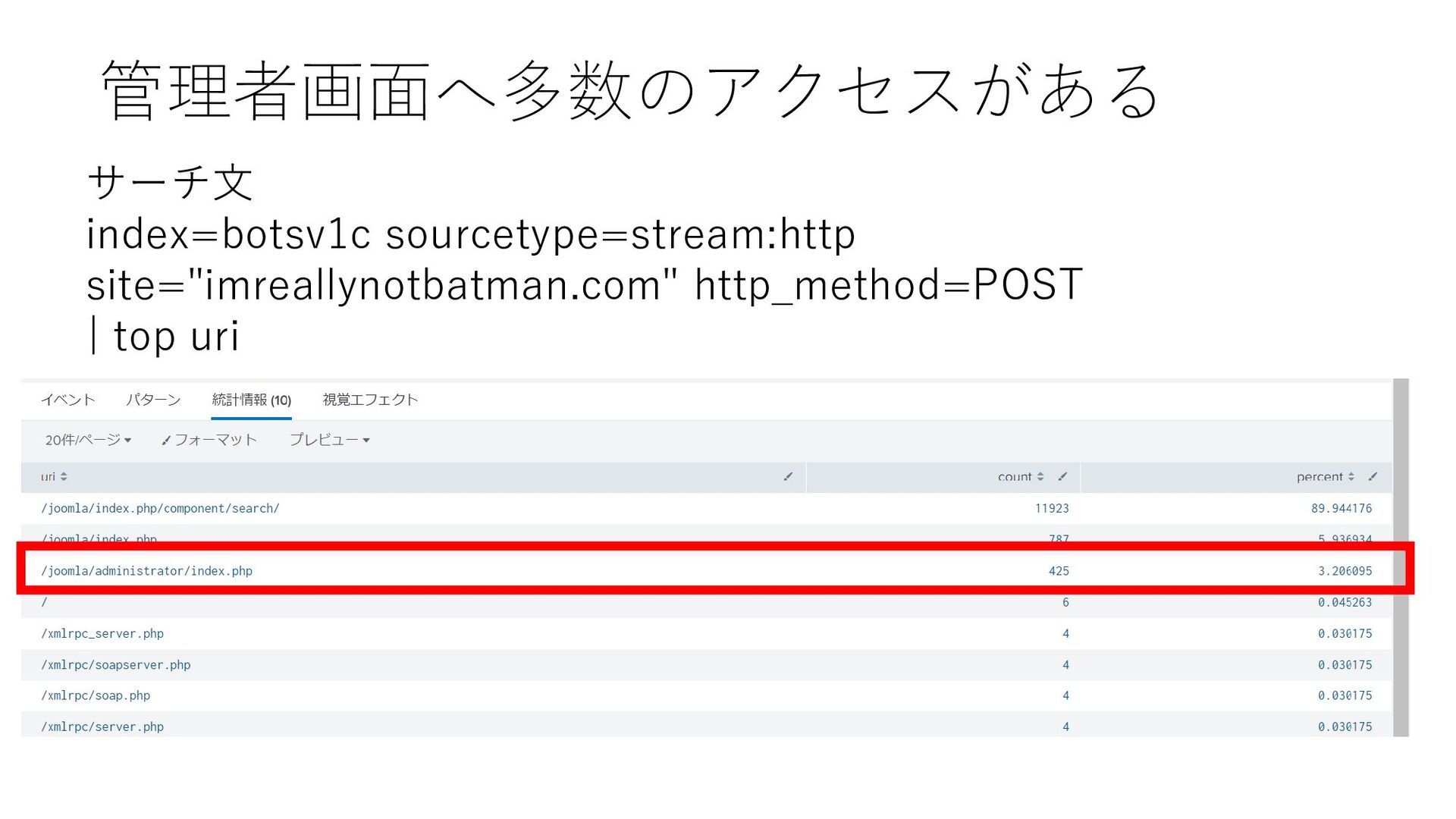 8. このサーチ文の結果を見てみると、joomlaという文字列があるURLへ多数のリクエストがあることがわかります。