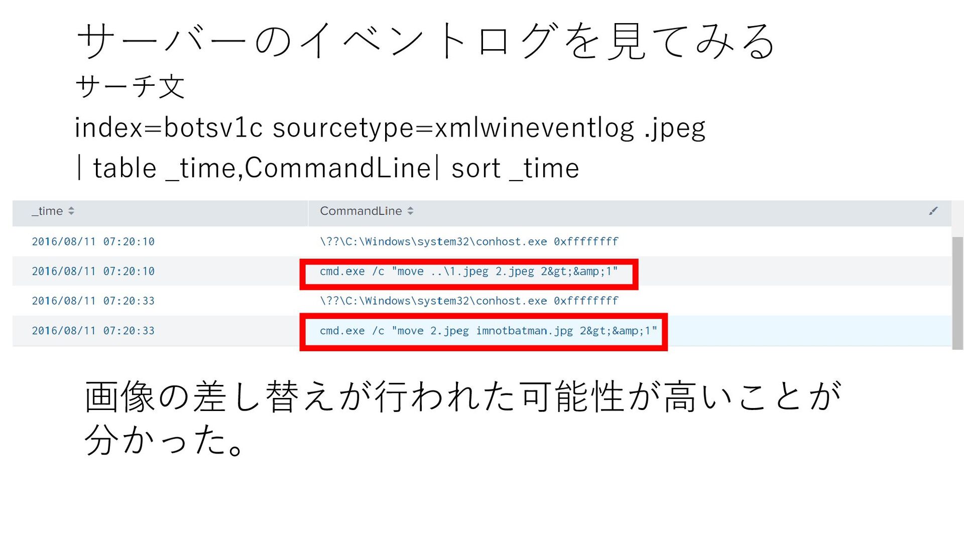 24. さらに調査を進めるとWebサーバーのイベントログで画像の差し替えを行うコマンドの履歴があり、