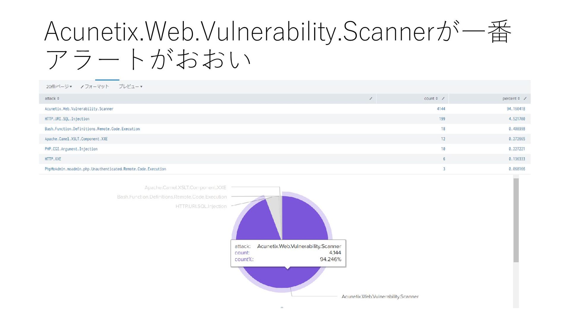 下のグラフを見てわかるとおり、Acunetix.Web.Vulnerability.Scannerというアラートが一番多く、