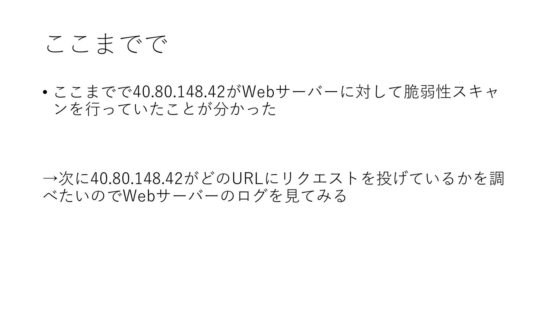 7. ここまでで、不審なIPアドレスである40.80.148.42が、Webサーバーであるimreallynotbatman.comへ脆弱性スキャンを行っていたことがわかりました。