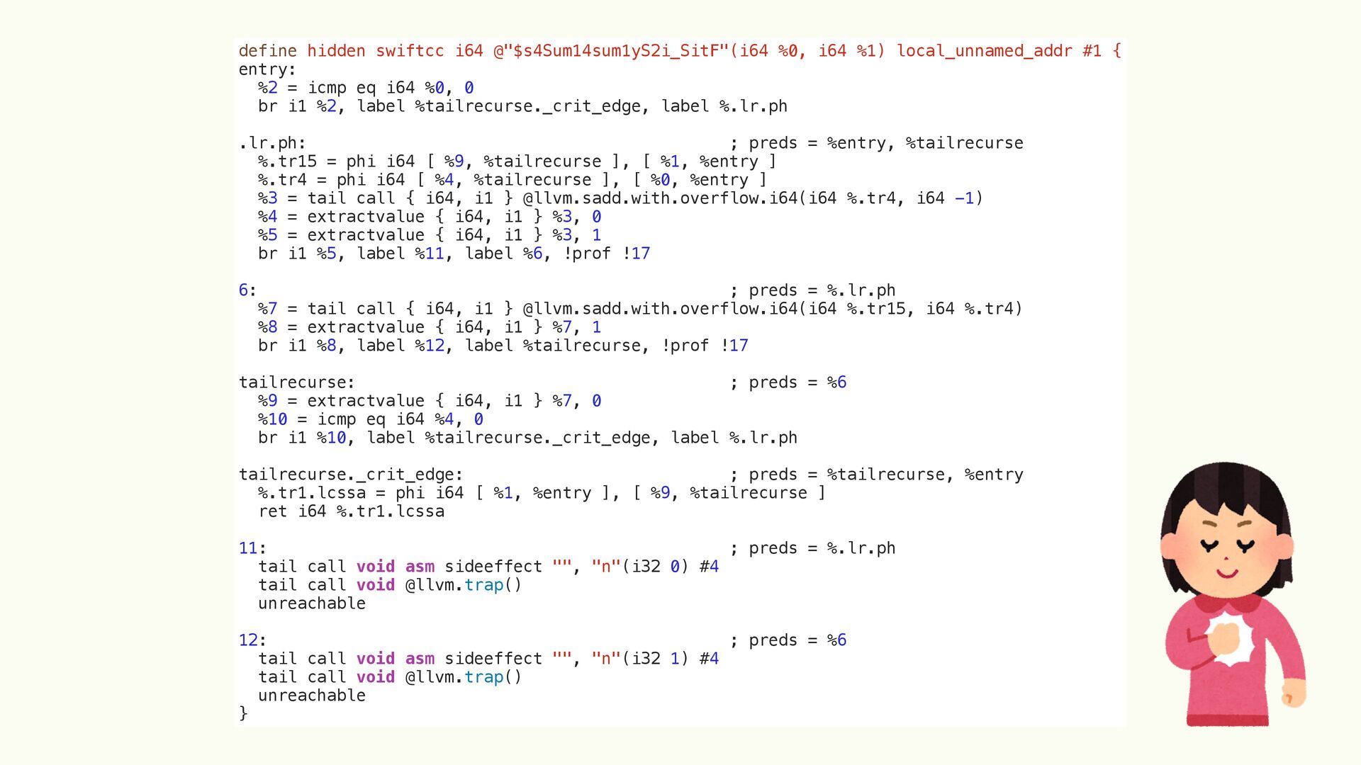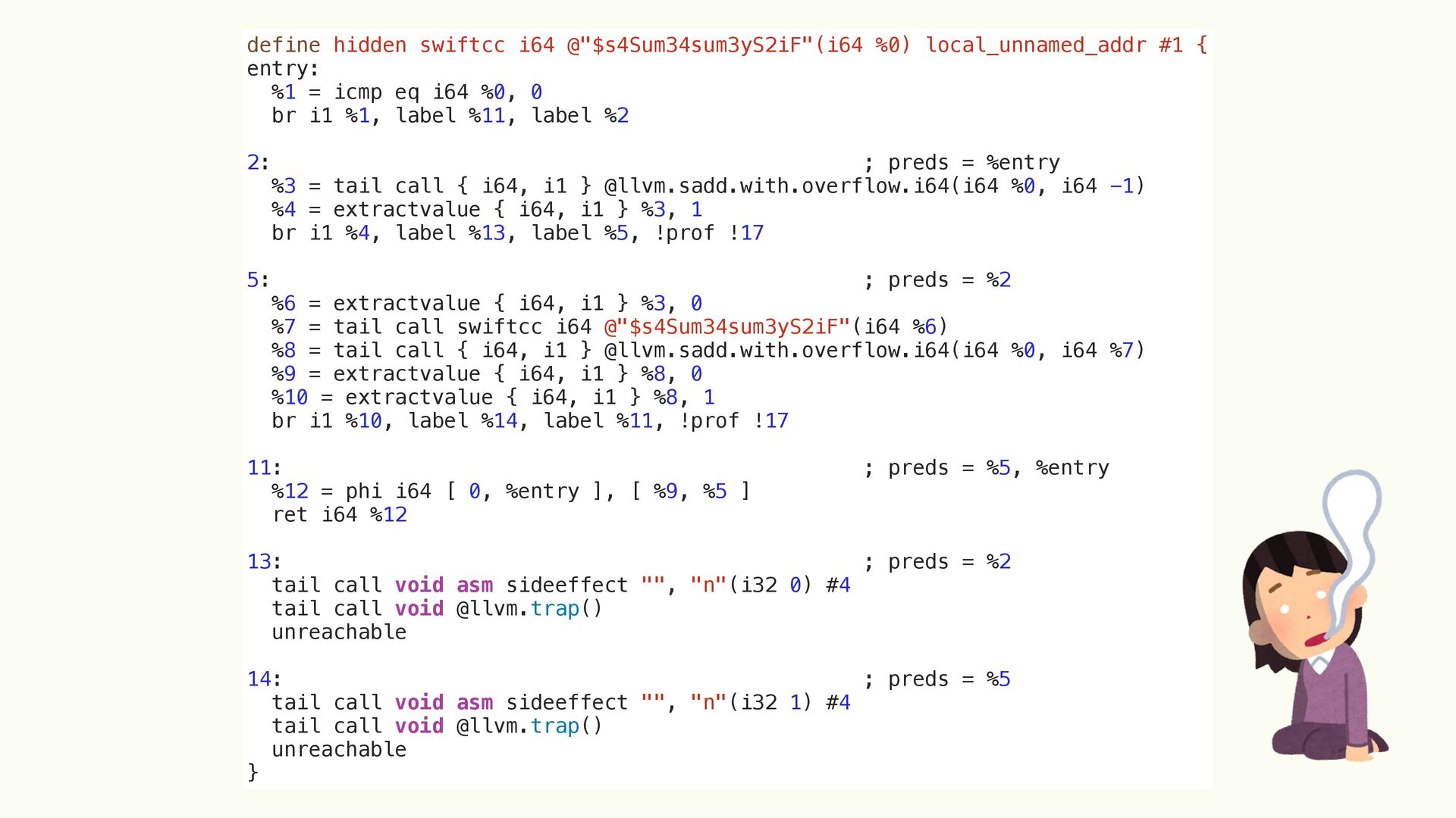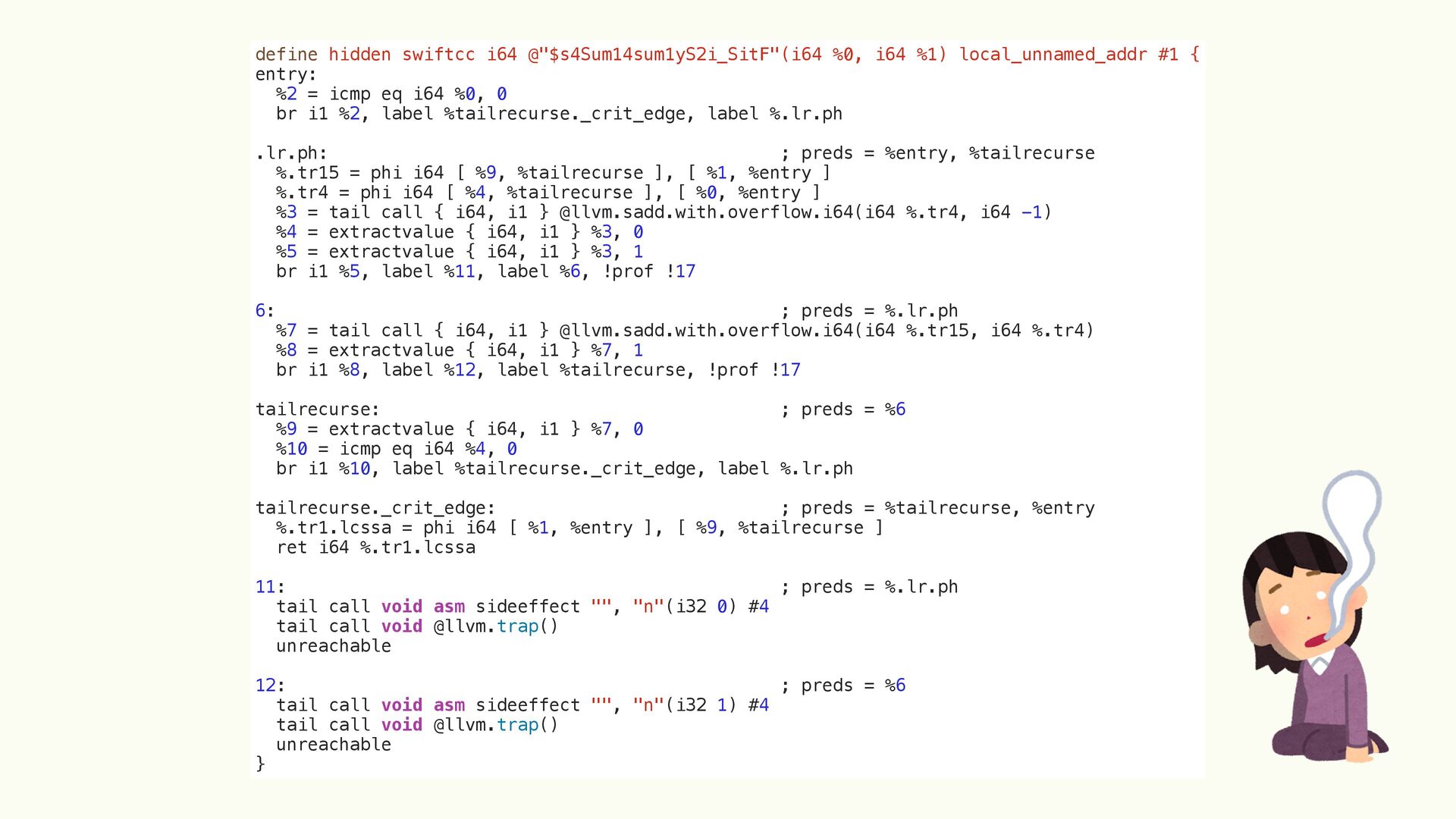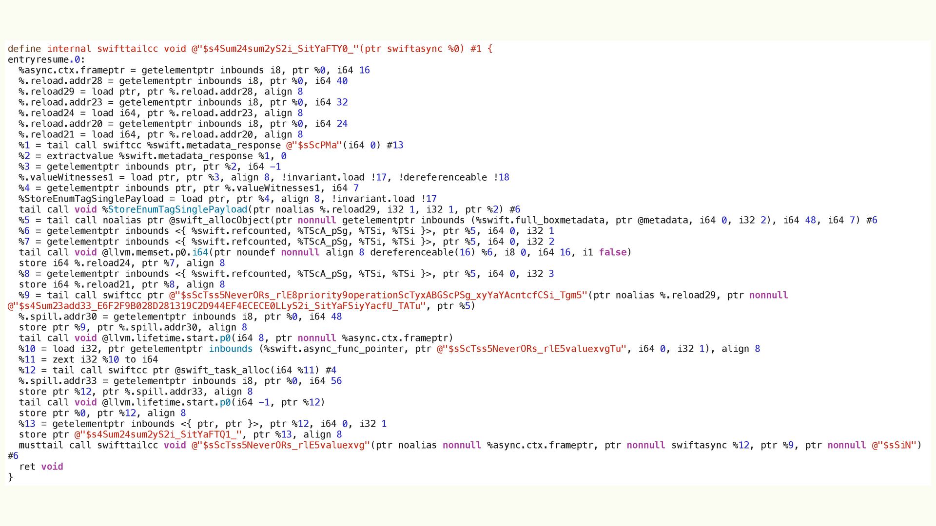 entry: %arr.debug = alloca ptr, align 8 call void @llvm.memset.p0.i64(ptr align 8 %arr.debug, i8 0, i64 8, i1 false) %accumulator.debug = alloca i64, align 8 call void @llvm.memset.p0.i64(ptr align 8 %accumulator.debug, i8 0, i64 8, i1 false) %2 = alloca %TSa, align 8 %3 = alloca %TSi, align 8 %4 = alloca %TSiSg, align 8 %5 = alloca %TSa, align 8 %6 = alloca %TSiSg, align 8 %first.debug = alloca i64, align 8 call void @llvm.memset.p0.i64(ptr align 8 %first.debug, i8 0, i64 8, i1 false) %7 = alloca %Ts10ArraySliceV, align 8 %8 = alloca %TSa, align 8 %9 = alloca %Ts10ArraySliceV, align 8 %rest.debug = alloca ptr, align 8 call void @llvm.memset.p0.i64(ptr align 8 %rest.debug, i8 0, i64 8, i1 false) store ptr %0, ptr %arr.debug, align 8 store i64 %1, ptr %accumulator.debug, align 8 %10 = call ptr @swift_bridgeObjectRetain(ptr returned %0) #9 call void @llvm.lifetime.start.p0(i64 8, ptr %2) %._buffer = getelementptr inbounds %TSa, ptr %2, i32 0, i32 0 %._buffer._storage = getelementptr inbounds %Ts12_ArrayBufferV, ptr %._buffer, i32 0, i32 0 %._buffer._storage.rawValue = getelementptr inbounds %Ts14_BridgeStorageV, ptr %._buffer._storage, i32 0, i32 0 store ptr %0, ptr %._buffer._storage.rawValue, align 8 %11 = call ptr @__swift_instantiateConcreteTypeFromMangledName(ptr @"$sSaySiGMD") #8 %12 = call ptr @"$sSaySiGSayxGSlsWl"() #14 %13 = call swiftcc i1 @"$sSlsE7isEmptySbvg"(ptr %11, ptr %12, ptr noalias nocapture swiftself %2) %14 = call ptr @"$sSaySiGWOh"(ptr %2) call void @llvm.lifetime.end.p0(i64 8, ptr %2) br i1 %13, label %15, label %16 15: ; preds = %entry br label %48 16: ; preds = %entry call void @llvm.lifetime.start.p0(i64 8, ptr %3) %17 = call ptr @swift_bridgeObjectRetain(ptr returned %0) #9 call void @llvm.lifetime.start.p0(i64 9, ptr %4) call void @llvm.lifetime.start.p0(i64 8, ptr %5) %._buffer1 = getelementptr inbounds %TSa, ptr %5, i32 0, i32 0 %._buffer1._storage = getelementptr inbounds %Ts12_ArrayBufferV, ptr %._buffer1, i32 0, i32 0 %._buffer1._storage.rawValue = getelementptr inbounds %Ts14_BridgeStorageV, ptr %._buffer1._storage, i32 0, i32 0 store ptr %0, ptr %._buffer1._storage.rawValue, align 8 call swiftcc void @"$sSlsE5first7ElementQzSgvg"(ptr noalias nocapture sret(%swift.opaque) %4, ptr %11, ptr %12, ptr noalias nocapture swiftself %5) %18 = call ptr @"$sSaySiGWOh"(ptr %5) call void @llvm.lifetime.end.p0(i64 8, ptr %5) %19 = load i64, ptr %4, align 8 %20 = getelementptr inbounds %TSiSg, ptr %4, i32 0, i32 1 %21 = load i1, ptr %20, align 8 call void @llvm.lifetime.start.p0(i64 9, ptr %6) store i64 %19, ptr %6, align 8 %22 = getelementptr inbounds %TSiSg, ptr %6, i32 0, i32 1 store i1 %21, ptr %22, align 8 %23 = load i64, ptr %6, align 8 %24 = getelementptr inbounds %TSiSg, ptr %6, i32 0, i32 1 %25 = load i1, ptr %24, align 8 br i1 %25, label %28, label %26 26: ; preds = %16 %._value6 = getelementptr inbounds %TSi, ptr %6, i32 0, i32 0 %27 = load i64, ptr %._value6, align 8 %._value7 = getelementptr inbounds %TSi, ptr %3, i32 0, i32 0 store i64 %27, ptr %._value7, align 8 call void @llvm.lifetime.end.p0(i64 9, ptr %6) br label %29 28: ; preds = %16 %._value = getelementptr inbounds %TSi, ptr %3, i32 0, i32 0 store i64 0, ptr %._value, align 8 call void @llvm.lifetime.end.p0(i64 9, ptr %6) br label %29 29: ; preds = %26, %28 call void @llvm.lifetime.end.p0(i64 9, ptr %4) %._value2 = getelementptr inbounds %TSi, ptr %3, i32 0, i32 0 %30 = load i64, ptr %._value2, align 8 store i64 %30, ptr %first.debug, align 8 call void @llvm.lifetime.end.p0(i64 8, ptr %3) call void @llvm.lifetime.start.p0(i64 32, ptr %7) %31 = call ptr @swift_bridgeObjectRetain(ptr returned %0) #9 call void @llvm.lifetime.start.p0(i64 8, ptr %8) %._buffer3 = getelementptr inbounds %TSa, ptr %8, i32 0, i32 0 %._buffer3._storage = getelementptr inbounds %Ts12_ArrayBufferV, ptr %._buffer3, i32 0, i32 0 %._buffer3._storage.rawValue = getelementptr inbounds %Ts14_BridgeStorageV, ptr %._buffer3._storage, i32 0, i32 0 store ptr %0, ptr %._buffer3._storage.rawValue, align 8 %32 = call swiftcc i64 @"$sSlsE9dropFirsty11SubSequenceQzSiFfA_"(ptr %11, ptr %12) call swiftcc void @"$sSlsE9dropFirsty11SubSequenceQzSiF"(ptr noalias nocapture sret(%swift.opaque) %7, i64 %32, ptr %11, ptr %12, ptr noalias nocapture swiftself %8) call void @llvm.lifetime.end.p0(i64 8, ptr %8) %._buffer4 = getelementptr inbounds %Ts10ArraySliceV, ptr %7, i32 0, i32 0 %._buffer4.owner = getelementptr inbounds %Ts12_SliceBufferV, ptr %._buffer4, i32 0, i32 0 %33 = getelementptr inbounds %AnyObject, ptr %._buffer4.owner, i32 0, i32 0 %34 = load ptr, ptr %33, align 8 %._buffer4.subscriptBaseAddress = getelementptr inbounds %Ts12_SliceBufferV, ptr %._buffer4, i32 0, i32 1 %._buffer4.subscriptBaseAddress._rawValue = getelementptr inbounds %TSp, ptr %._buffer4.subscriptBaseAddress, i32 0, i32 0 %35 = load ptr, ptr %._buffer4.subscriptBaseAddress._rawValue, align 8 %._buffer4.startIndex = getelementptr inbounds %Ts12_SliceBufferV, ptr %._buffer4, i32 0, i32 2 %._buffer4.startIndex._value = getelementptr inbounds %TSi, ptr %._buffer4.startIndex, i32 0, i32 0 %36 = load i64, ptr %._buffer4.startIndex._value, align 8 %._buffer4.endIndexAndFlags = getelementptr inbounds %Ts12_SliceBufferV, ptr %._buffer4, i32 0, i32 3 %._buffer4.endIndexAndFlags._value = getelementptr inbounds %TSu, ptr %._buffer4.endIndexAndFlags, i32 0, i32 0 %37 = load i64, ptr %._buffer4.endIndexAndFlags._value, align 8 call void @llvm.lifetime.start.p0(i64 32, ptr %9) %._buffer5 = getelementptr inbounds %Ts10ArraySliceV, ptr %9, i32 0, i32 0 %._buffer5.owner = getelementptr inbounds %Ts12_SliceBufferV, ptr %._buffer5, i32 0, i32 0 %38 = getelementptr inbounds %AnyObject, ptr %._buffer5.owner, i32 0, i32 0 store ptr %34, ptr %38, align 8 %._buffer5.subscriptBaseAddress = getelementptr inbounds %Ts12_SliceBufferV, ptr %._buffer5, i32 0, i32 1 %._buffer5.subscriptBaseAddress._rawValue = getelementptr inbounds %TSp, ptr %._buffer5.subscriptBaseAddress, i32 0, i32 0 store ptr %35,