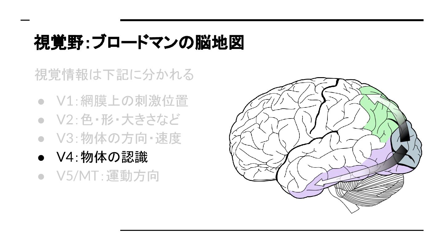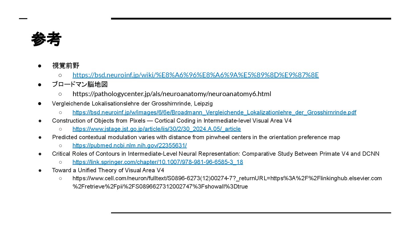 3. 参考 • 視覚前野 ◦ https://bsd.neuroinf.jp/wiki/%E8%A6%96%E8%A6%9A%E5%89%8D%E9%87%8E • ブロードマン脳地図 ◦ https://pathologycenter.jp/als/neuroanatomy/neuroanatomy6.html •