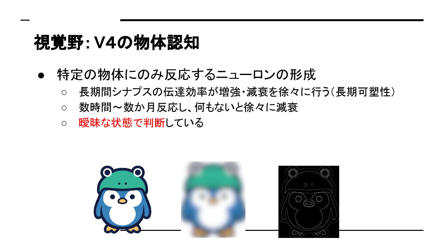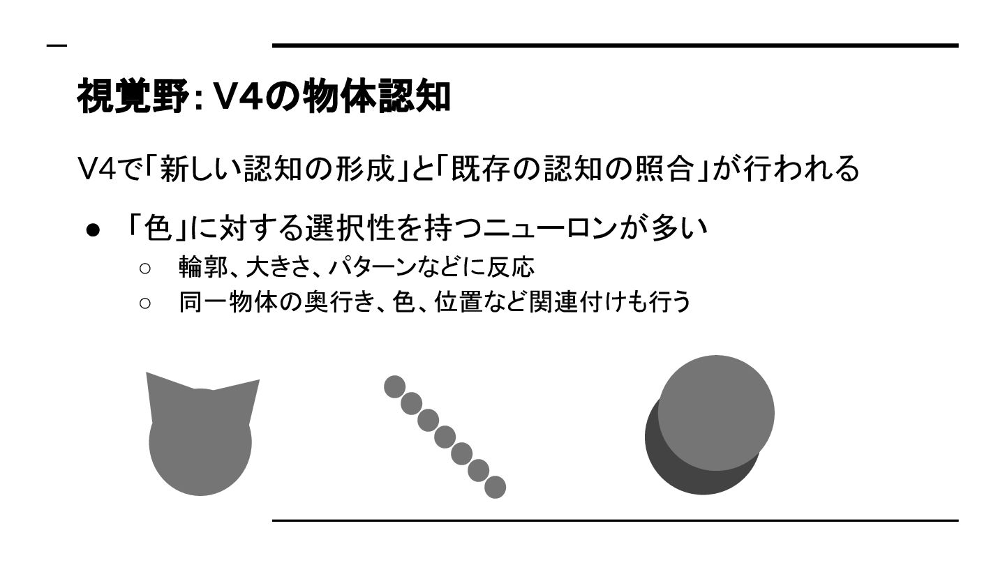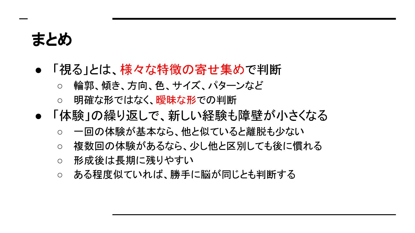 2. まとめ • 「視る」とは、様々な特徴の寄せ集めで判断 ◦ 輪郭、傾き、方向、色、サイズ、パターンなど ◦ 明確な形ではなく、曖昧な形での判断 • 「体験」の繰り返しで、新しい経験も障壁が小さくなる ◦