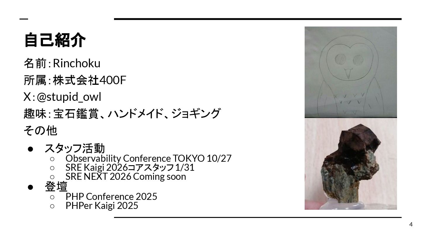 1. 自己紹介 名前:Rinchoku 所属:株式会社400F X:@stupid_owl 趣味:宝石鑑賞、ハンドメイド、ジョギング その他 • スタッフ活動 ◦ Observability