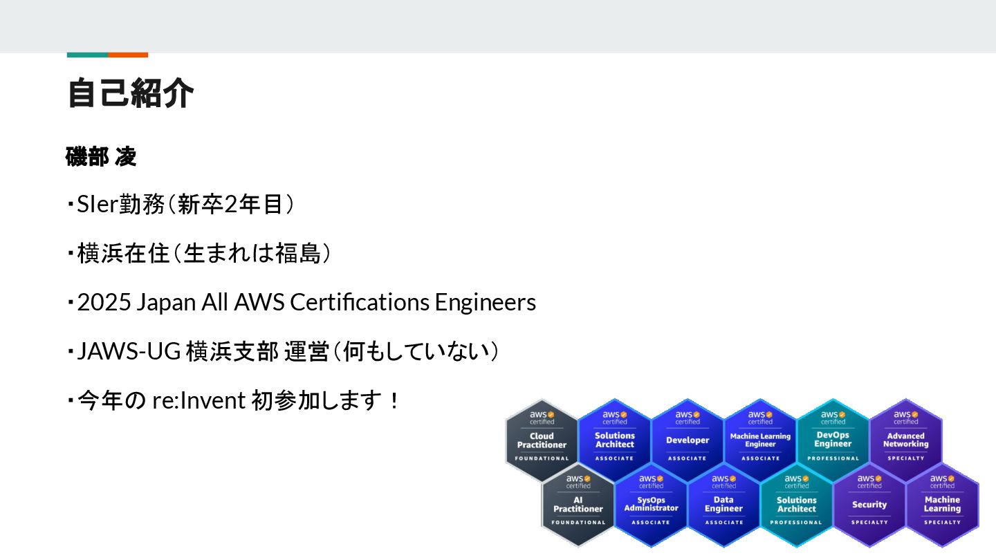 自己紹介 磯部 凌 ・SIer勤務(新卒2年目) ・横浜在住(生まれは福島) ・2025 Japan All AWS Certifications