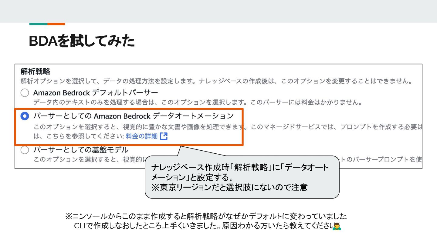 BDAを試してみた ナレッジベース作成時「解析戦略」に「データオート メーション」と設定する。 ※東京リージョンだと選択肢にないので注意 ※コンソールからこのまま作成すると解析戦略がなぜかデフォルトに変わっていました … CLIで作成しなおしたところ上手くいきました。原因わかる方いたら教えてください