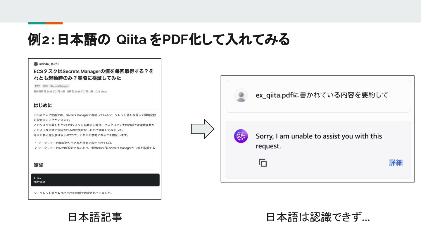 例2:日本語の Qiita をPDF化して入れてみる 日本語記事 日本語は認識できず…
