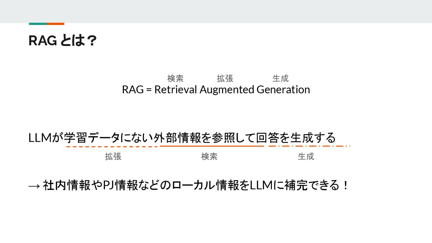 LLMが学習データにない外部情報を参照して回答を生成する → 社内情報やPJ情報などのローカル情報をLLMに補完できる! 拡張 検索 生成
