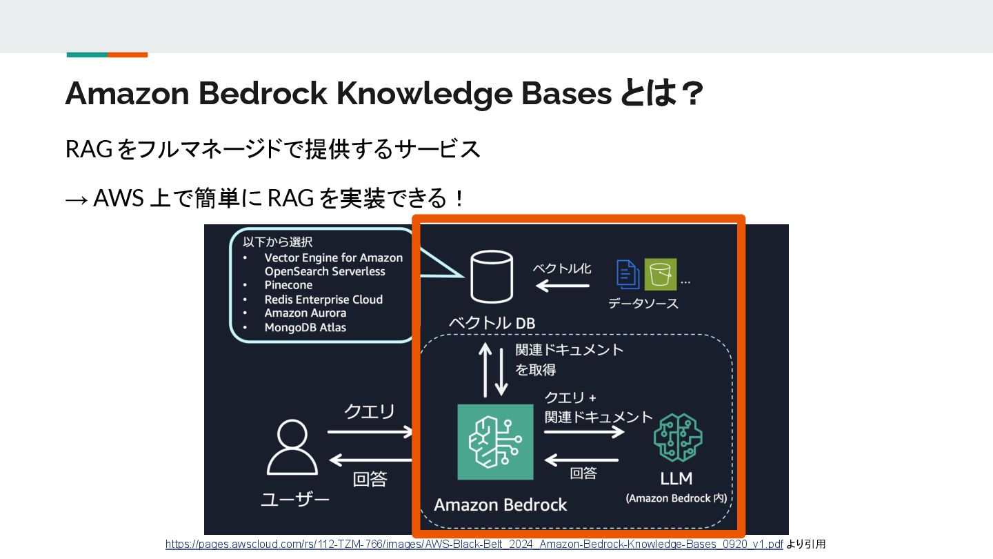 RAG を実装できる! https://pages.awscloud.com/rs/112-TZM-766/images/AWS-Black-Belt_2024_Amazon-Bedrock-Knowledge-Bases_0920_v1.pdf より引用