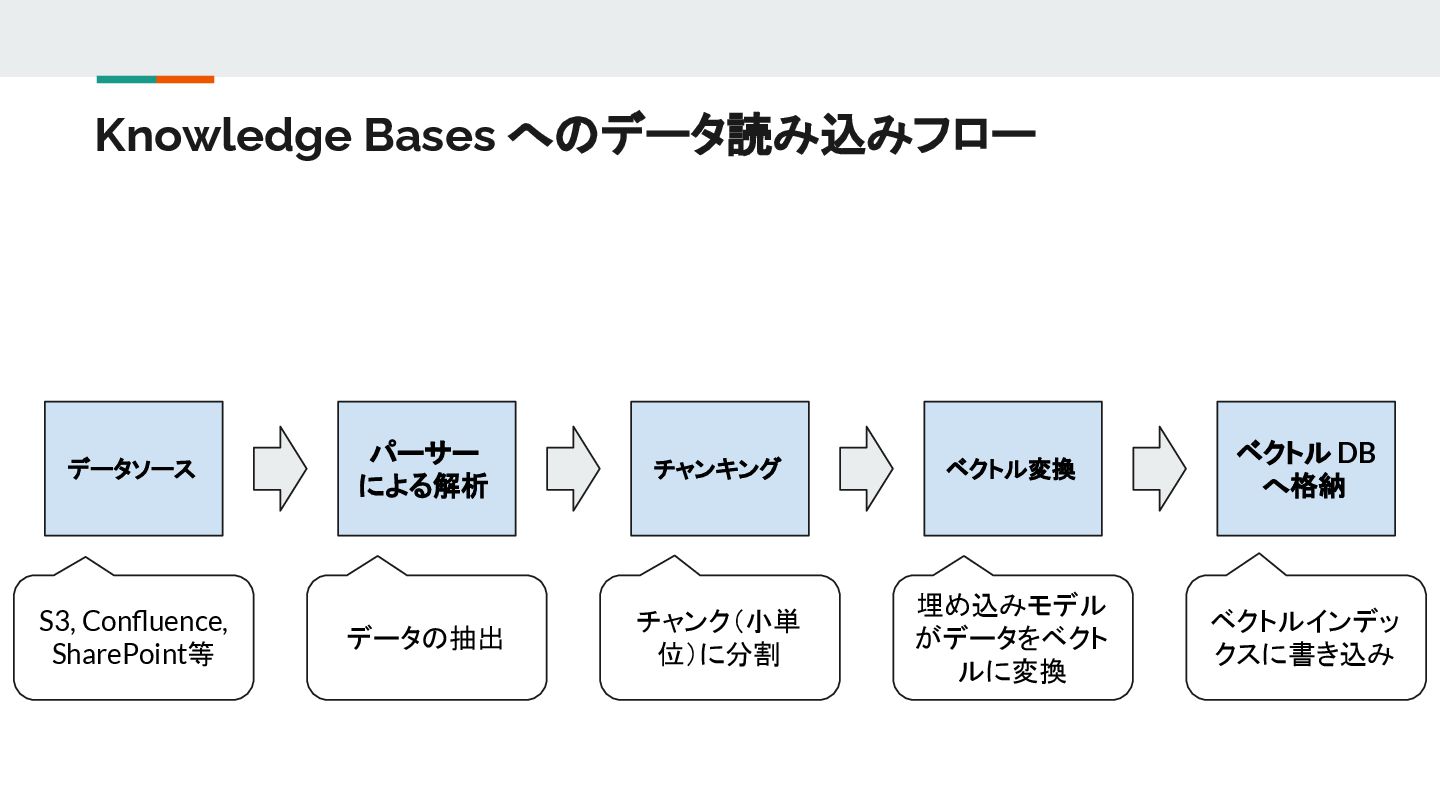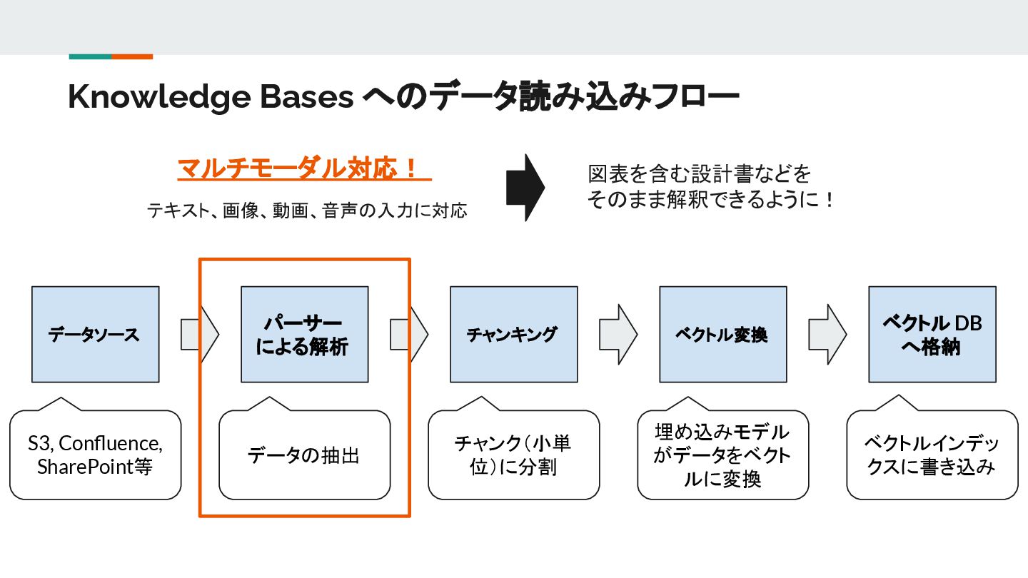 Knowledge Bases へのデータ読み込みフロー データソース パーサー による解析 チャンキング ベクトル変換 ベクトル DB