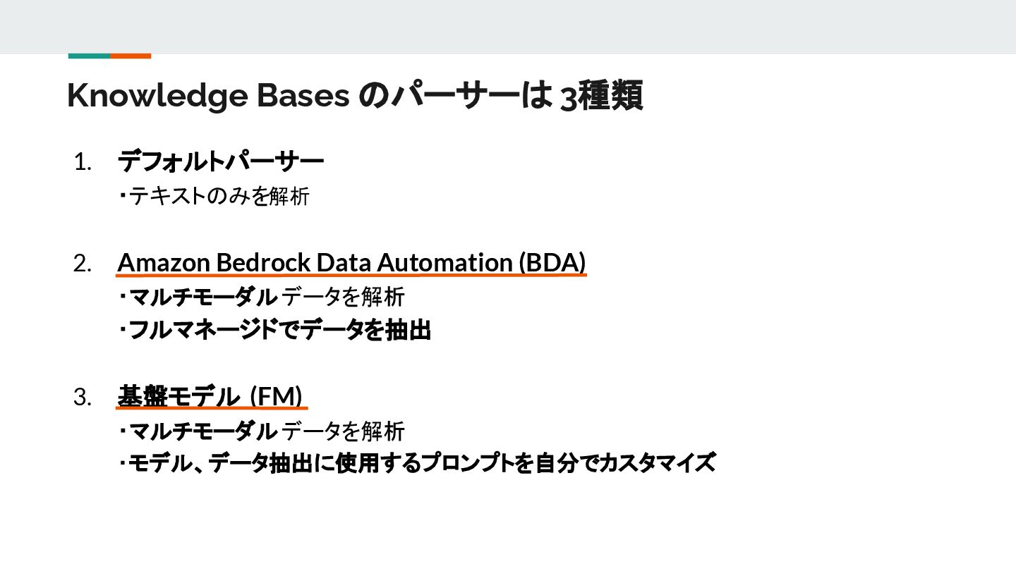 Knowledge Bases のパーサーは 3種類 1. デフォルトパーサー ・テキストのみを解析 2. Amazon Bedrock