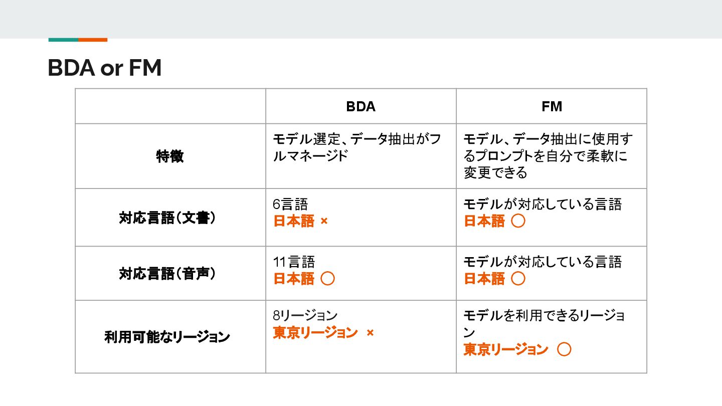 BDA or FM BDA FM 特徴 モデル選定、データ抽出がフ ルマネージド モデル、データ抽出に使用す るプロンプトを自分で柔軟に