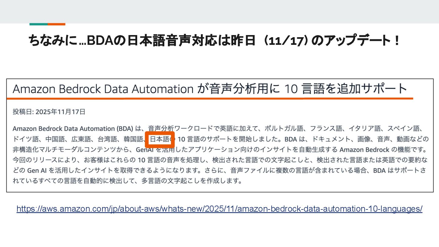 ちなみに…BDAの日本語音声対応は昨日 (11/17) のアップデート! https://aws.amazon.com/jp/about-aws/whats-new/2025/11/amazon-bedrock-data-automation-10-languages/