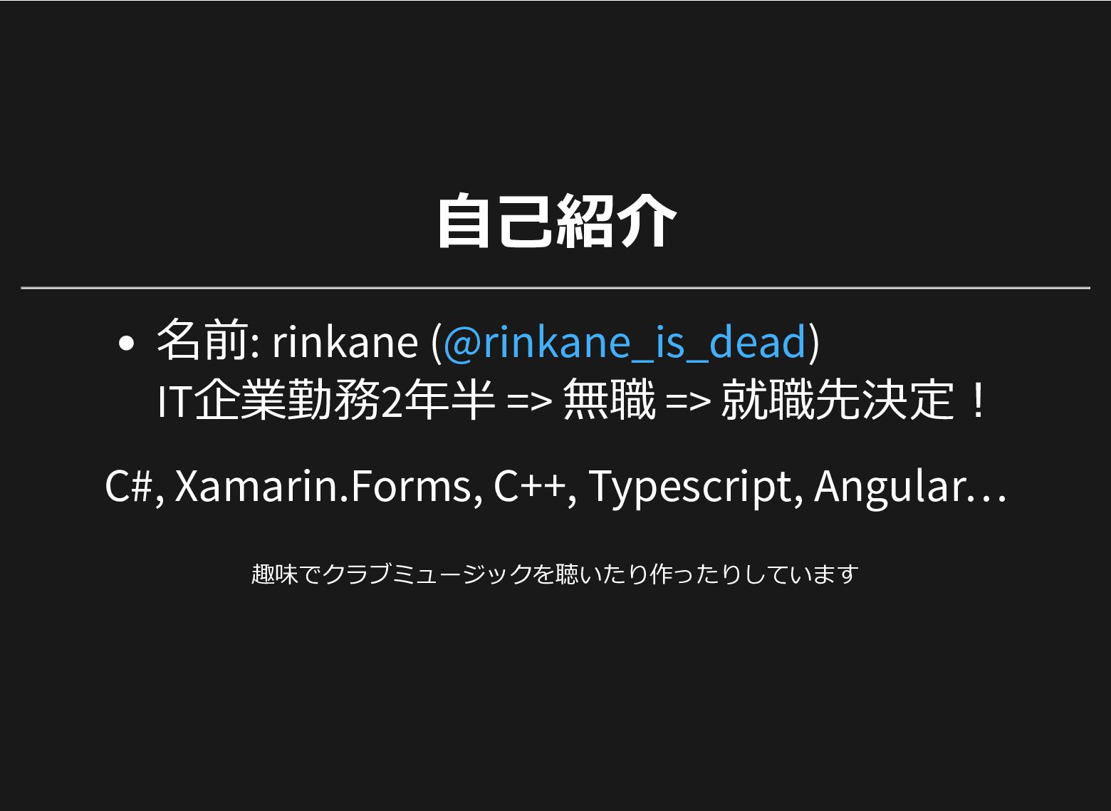 C#, Xamarin.Forms, C++, Typescript, Angular… 趣味でクラブミュージックを聴いたり作ったりしています @rinkane_is_dead