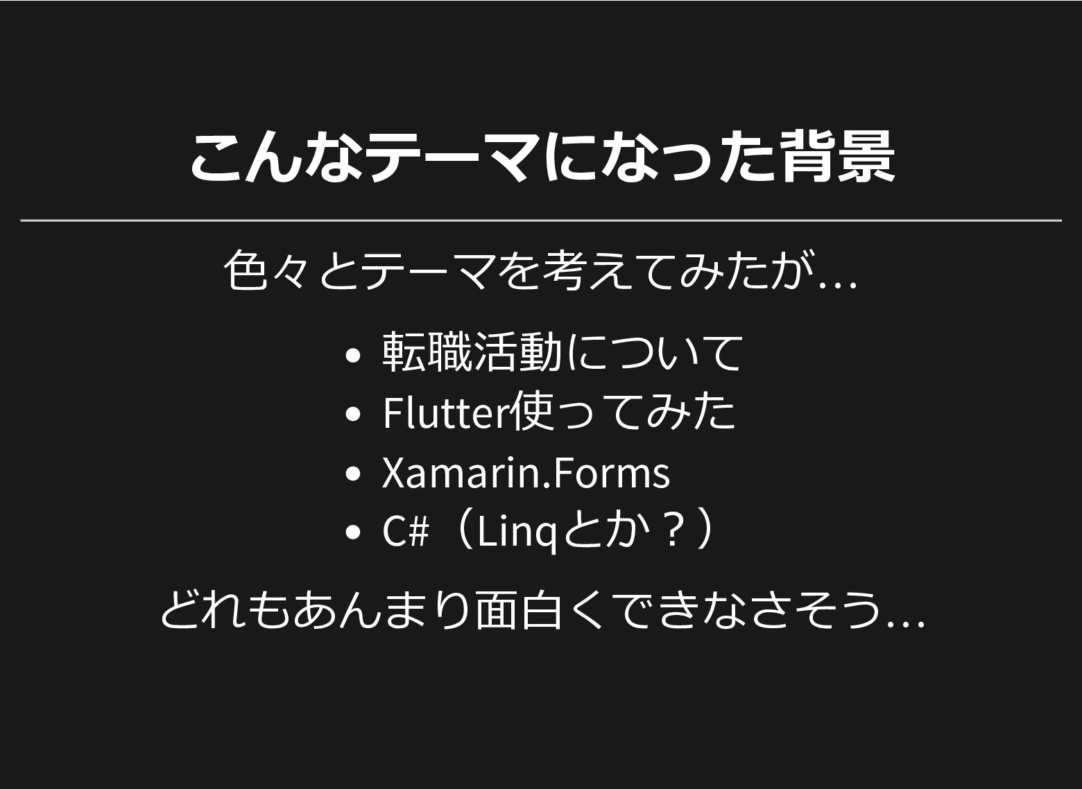 こんなテーマになった背景 色々とテーマを考えてみたが… どれもあんまり面白くできなさそう… 転職活動について Flutter使ってみた Xamarin.Forms C#(Linqとか?)