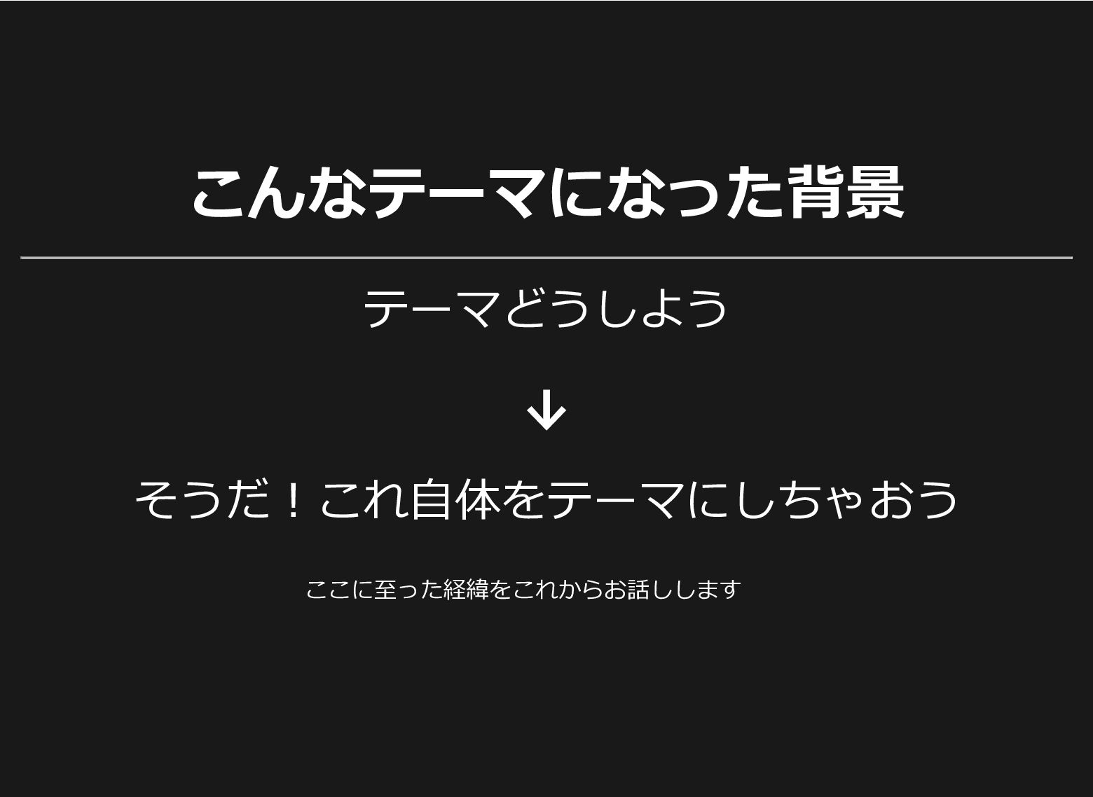 こんなテーマになった背景 テーマどうしよう ↓ そうだ!これ自体をテーマにしちゃおう ここに至った経緯をこれからお話しします