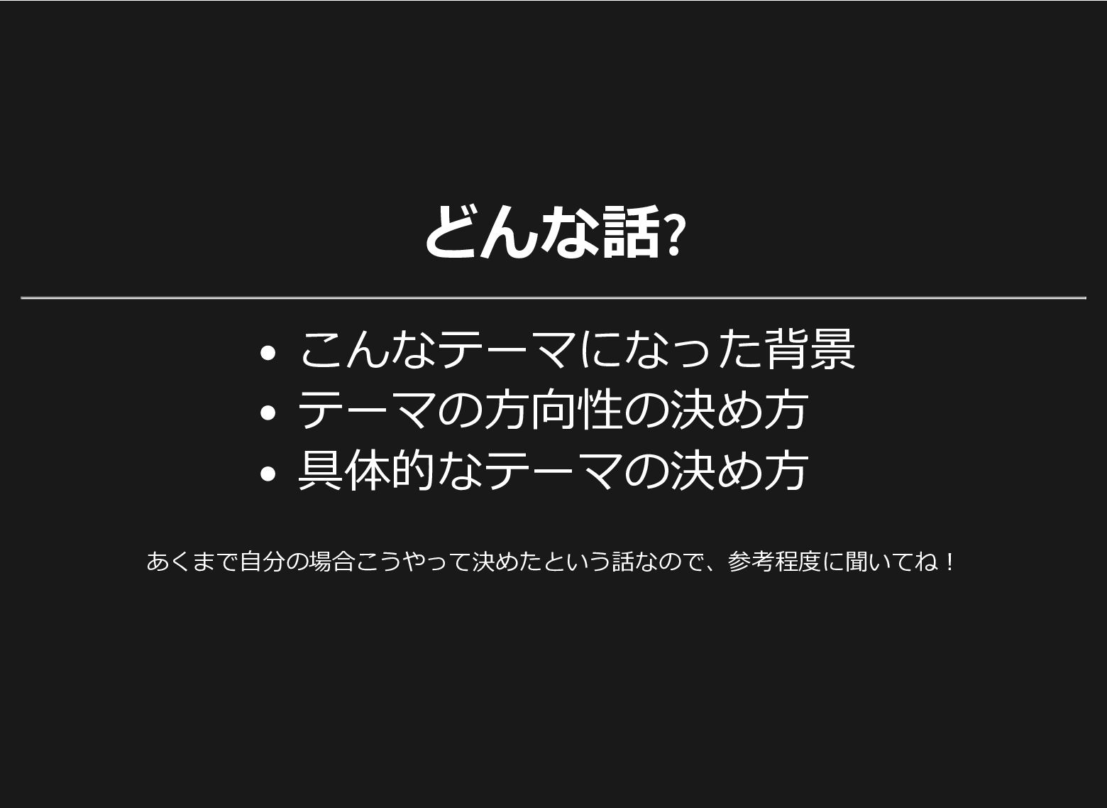 どんな話? こんなテーマになった背景 テーマの方向性の決め方 具体的なテーマの決め方 あくまで自分の場合こうやって決めたという話なので、参考程度に聞いてね!