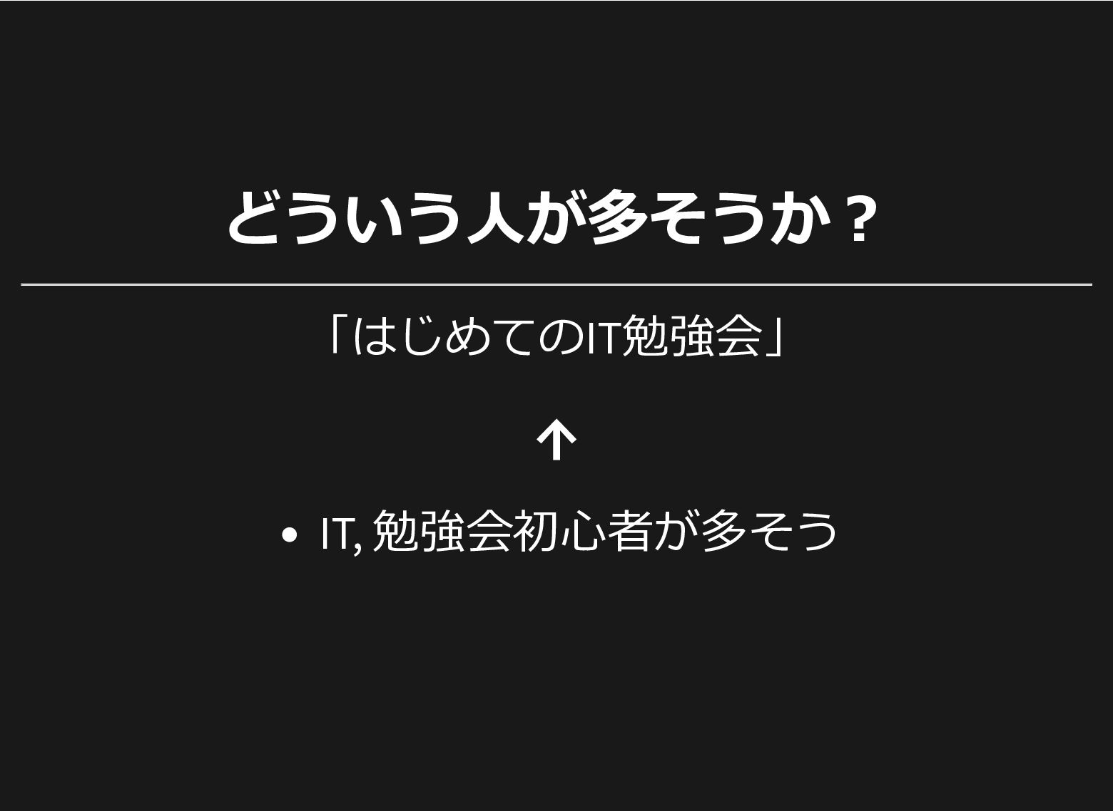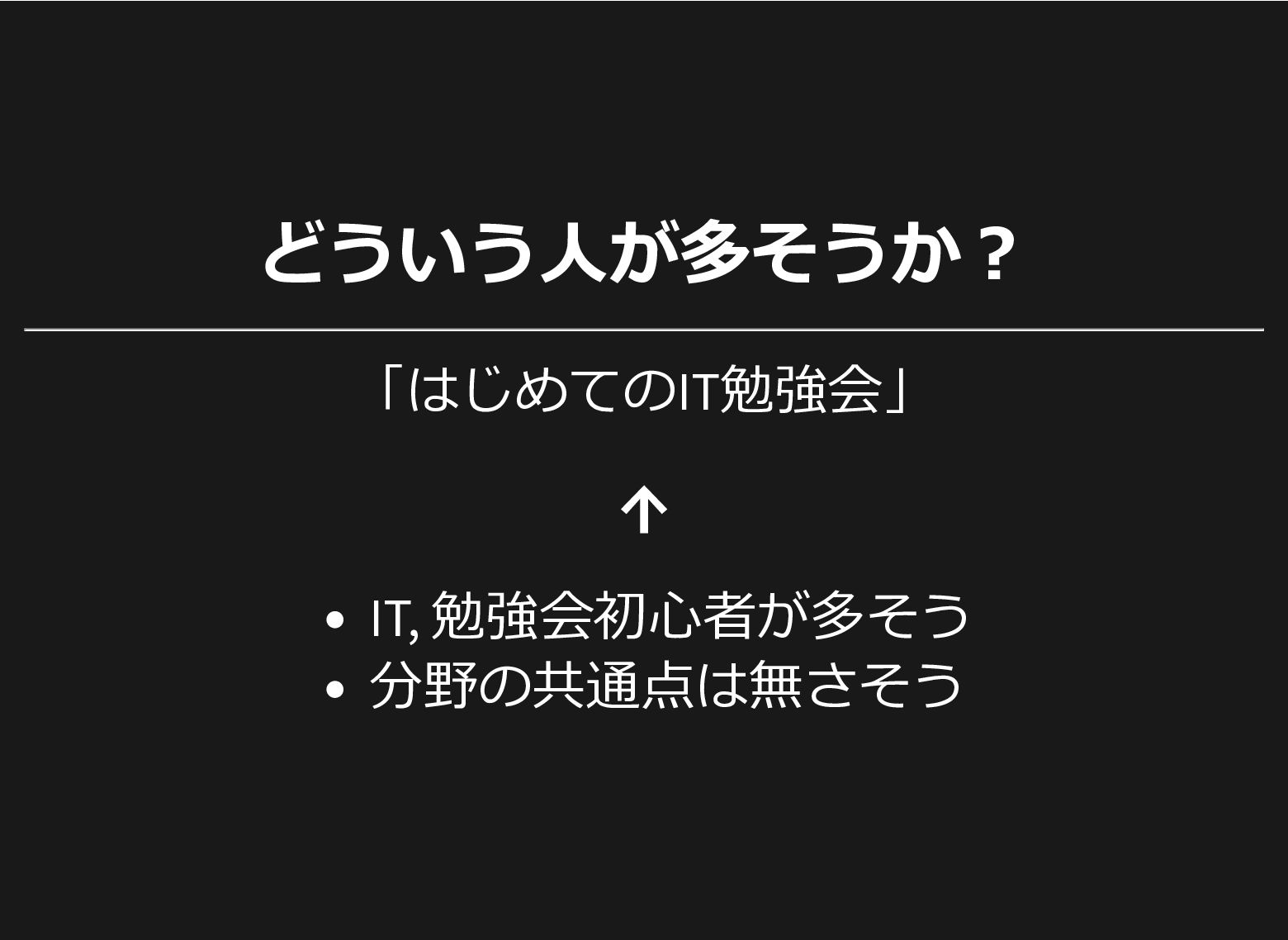 どういう人が多そうか? 「はじめてのIT勉強会」 ↑ IT, 勉強会初心者が多そう 分野の共通点は無さそう
