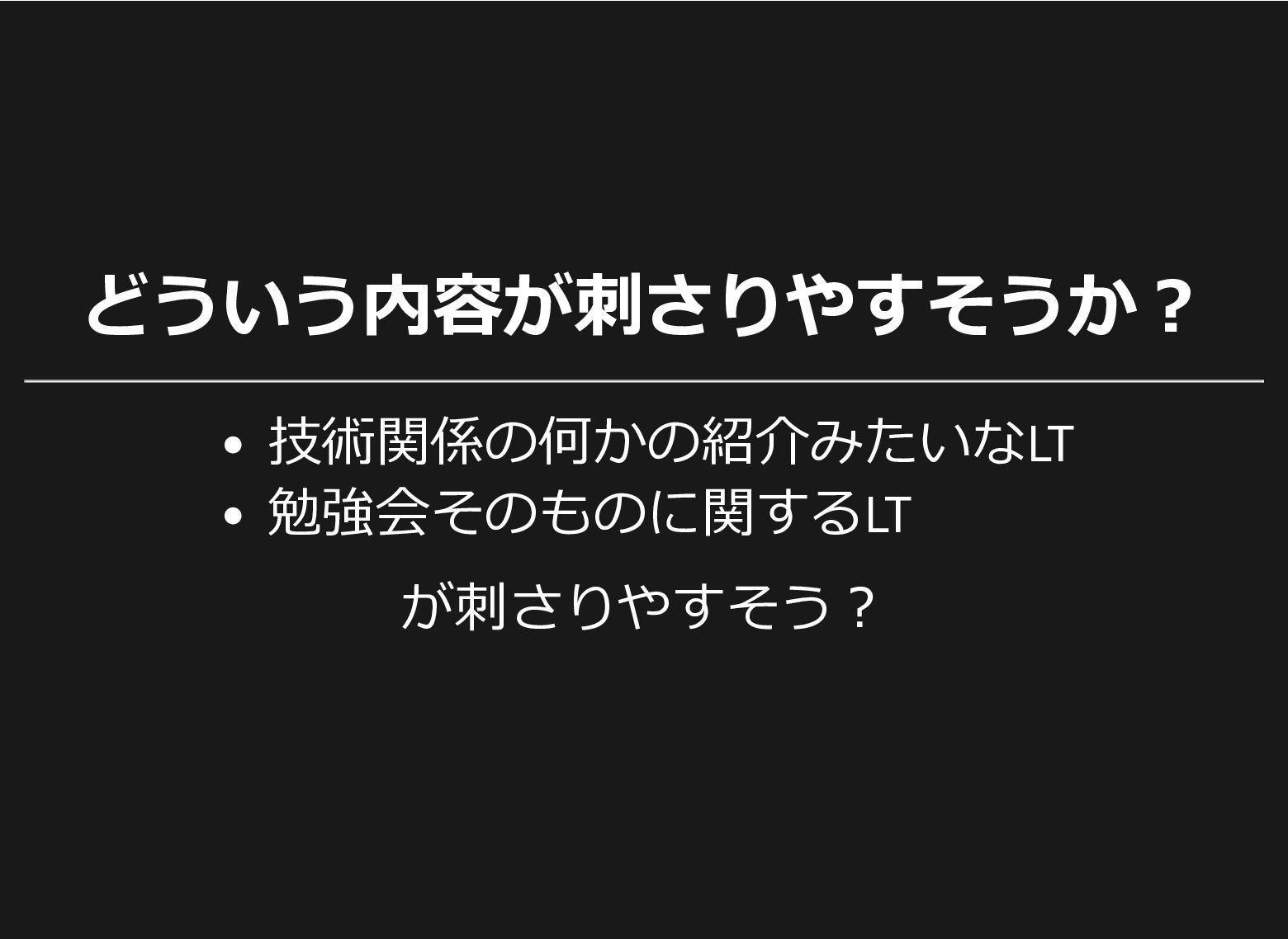 どういう内容が刺さりやすそうか? 技術関係の何かの紹介みたいなLT 勉強会そのものに関するLT が刺さりやすそう?