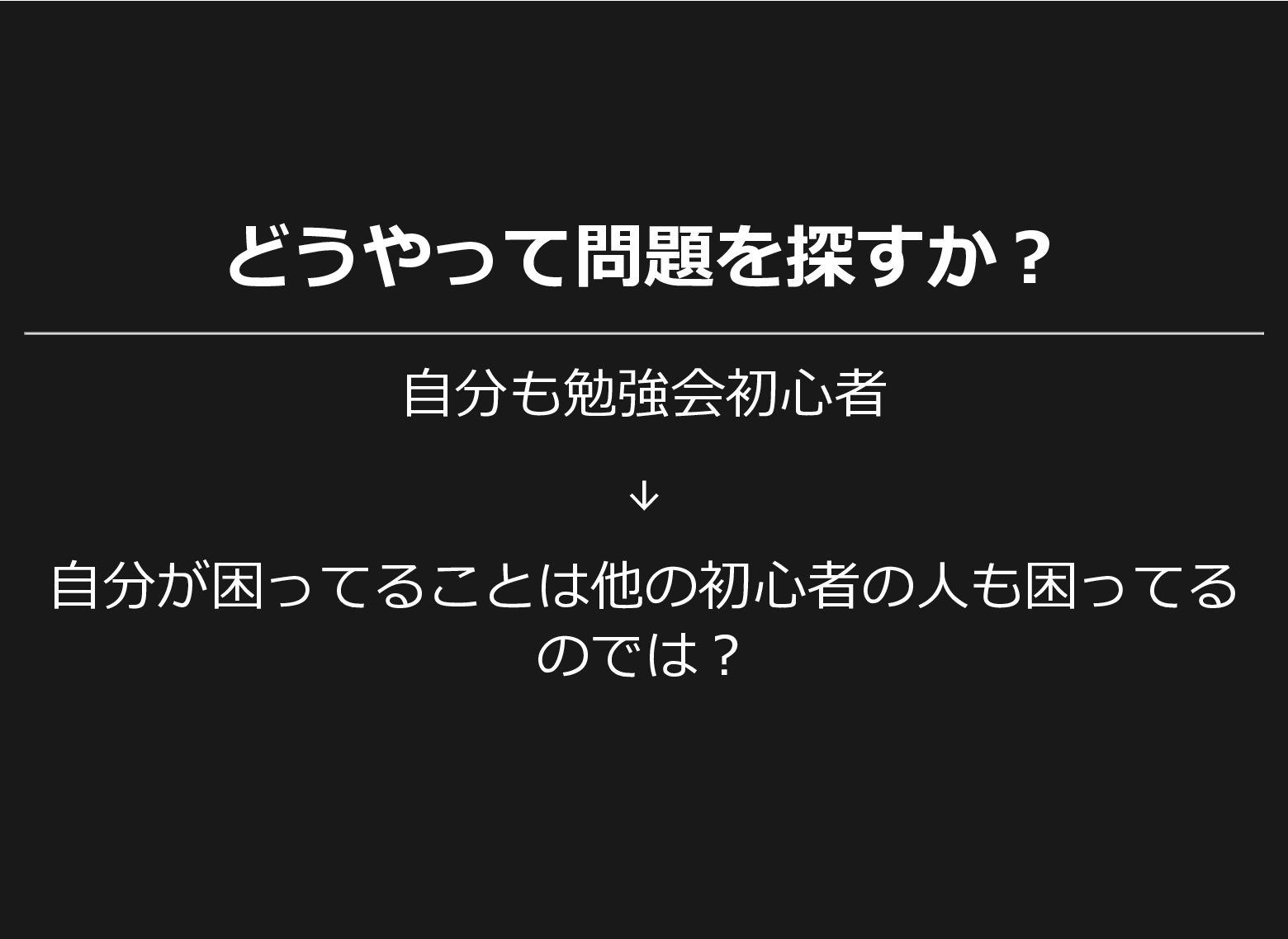 どうやって問題を探すか? 自分も勉強会初心者 ↓ 自分が困ってることは他の初心者の人も困ってる のでは?
