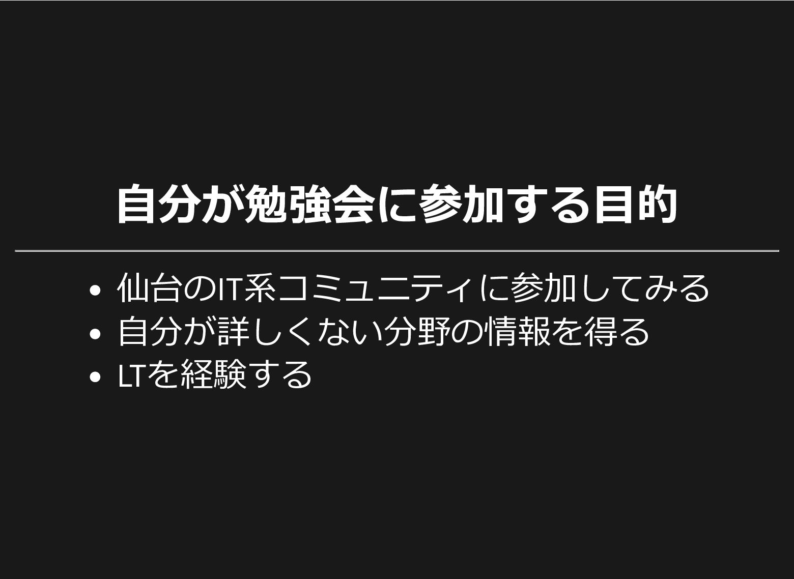 自分が勉強会に参加する目的 仙台のIT系コミュニティに参加してみる 自分が詳しくない分野の情報を得る LTを経験する
