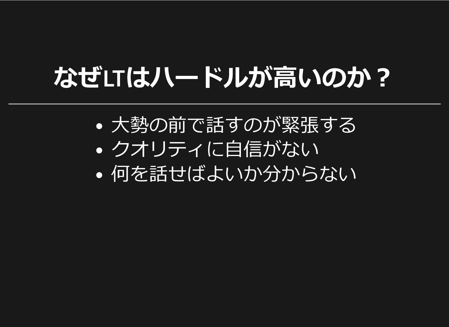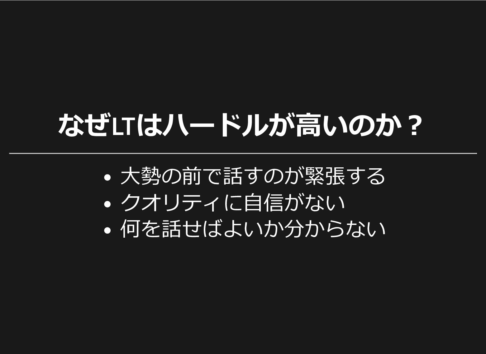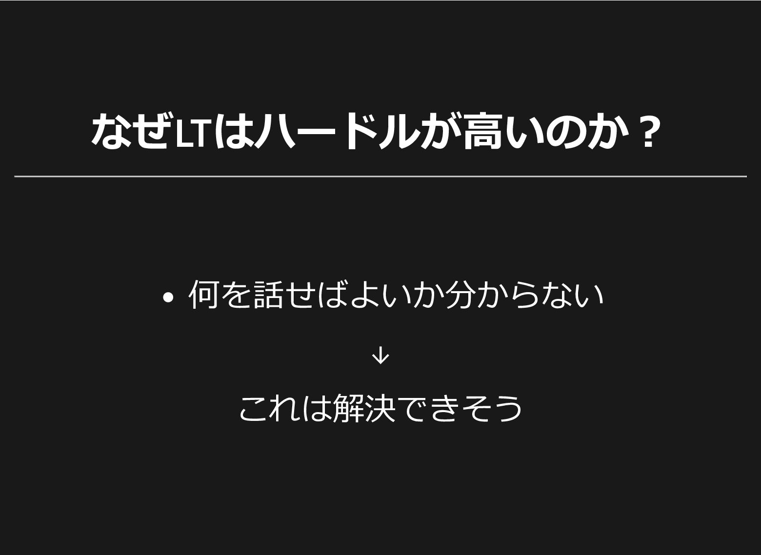 なぜLTはハードルが高いのか? 何を話せばよいか分からない ↓ これは解決できそう