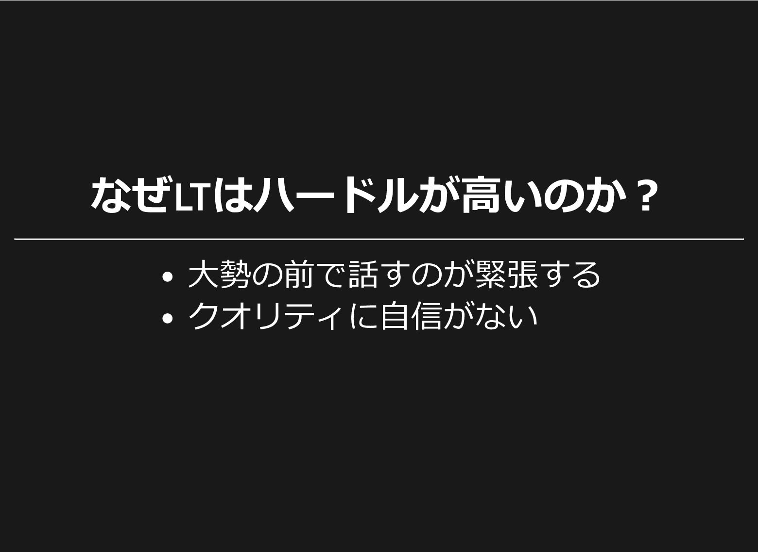 なぜLTはハードルが高いのか? 大勢の前で話すのが緊張する クオリティに自信がない 何を話せばよいか分からない