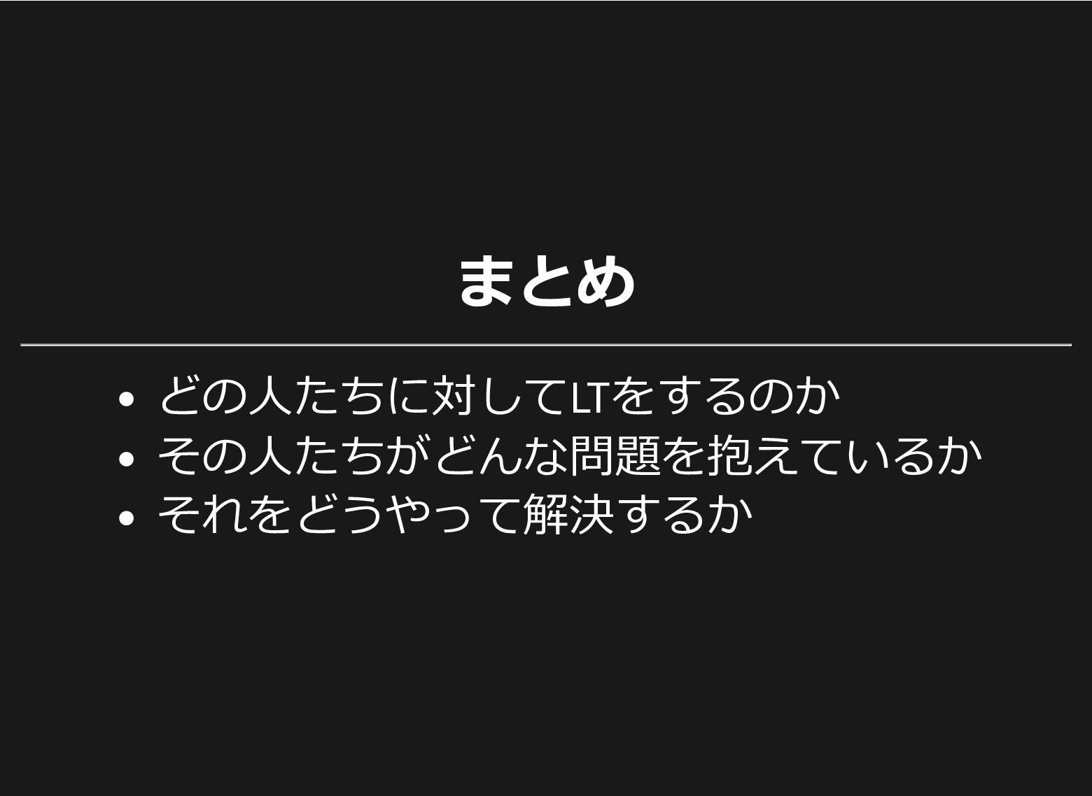 まとめ どの人たちに対してLTをするのか その人たちがどんな問題を抱えているか それをどうやって解決するか
