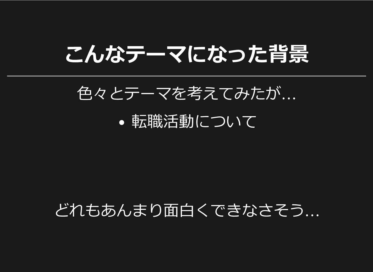 こんなテーマになった背景 色々とテーマを考えてみたが… どれもあんまり面白くできなさそう… 転職活動について