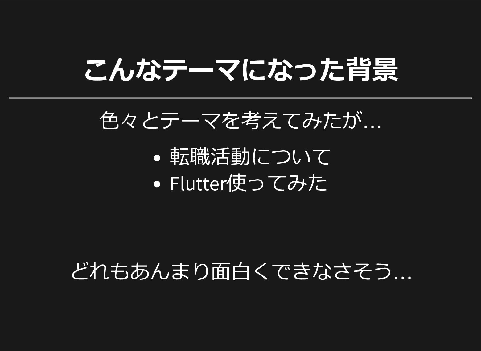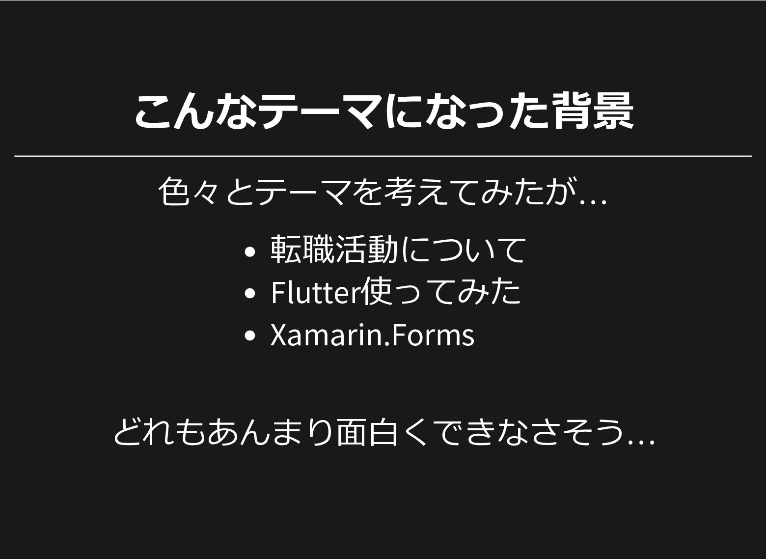 こんなテーマになった背景 色々とテーマを考えてみたが… どれもあんまり面白くできなさそう… 転職活動について Flutter使ってみた Xamarin.Forms