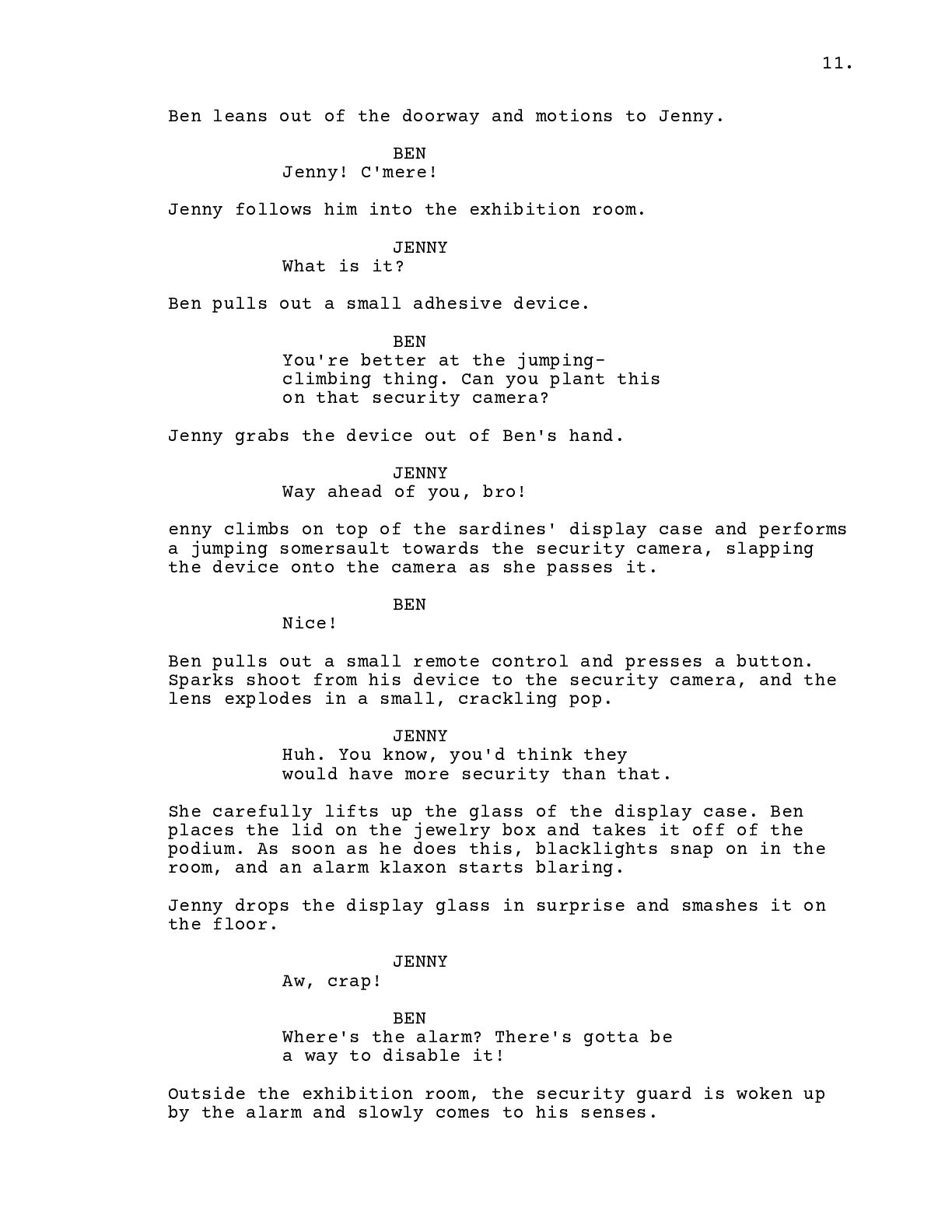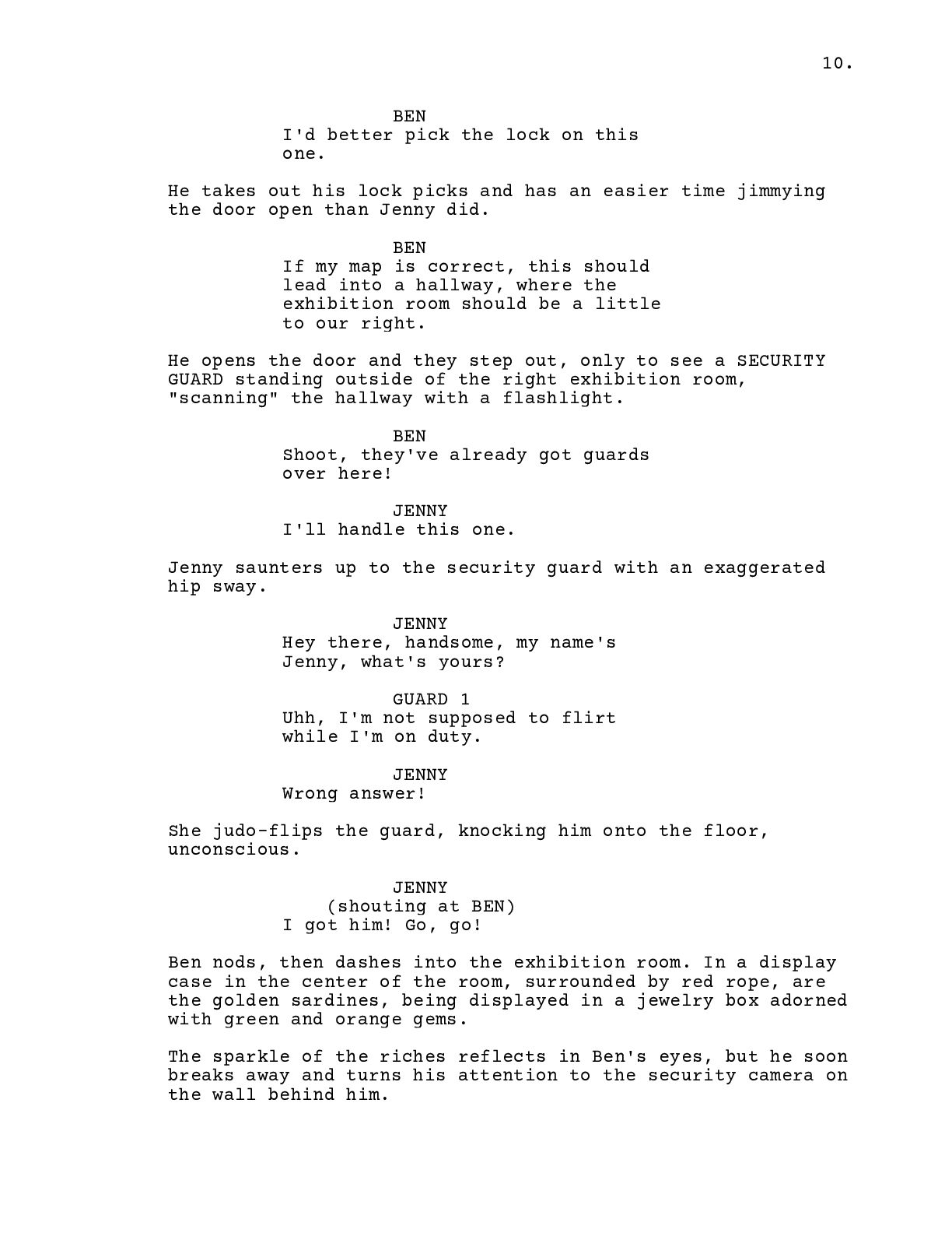 takes out his lock picks and has an easier time jimmying the door open than Jenny did. BEN If my map is correct, this should lead into a hallway, where the exhibition room should be a little to our right. He opens the door and they step out, only to see a SECURITY GUARD standing outside of the right exhibition room, "scanning" the hallway with a flashlight. BEN Shoot, they've already got guards over here! JENNY I'll handle this one. Jenny saunters up to the security guard with an exaggerated hip sway. JENNY Hey there, handsome, my name's Jenny, what's yours? GUARD 1 Uhh, I'm not supposed to flirt while I'm on duty. JENNY Wrong answer! She judo-flips the guard, knocking him onto the floor, unconscious. JENNY (shouting at BEN) I got him! Go, go! Ben nods, then dashes into the exhibition room. In a display case in the center of the room, surrounded by red rope, are the golden sardines, being displayed in a jewelry box adorned with green and orange gems. The sparkle of the riches reflects in Ben's eyes, but he soon breaks away and turns his attention to the security camera on the wall behind him. Ben leans out of the doorway and motions to Jenny. 10.
