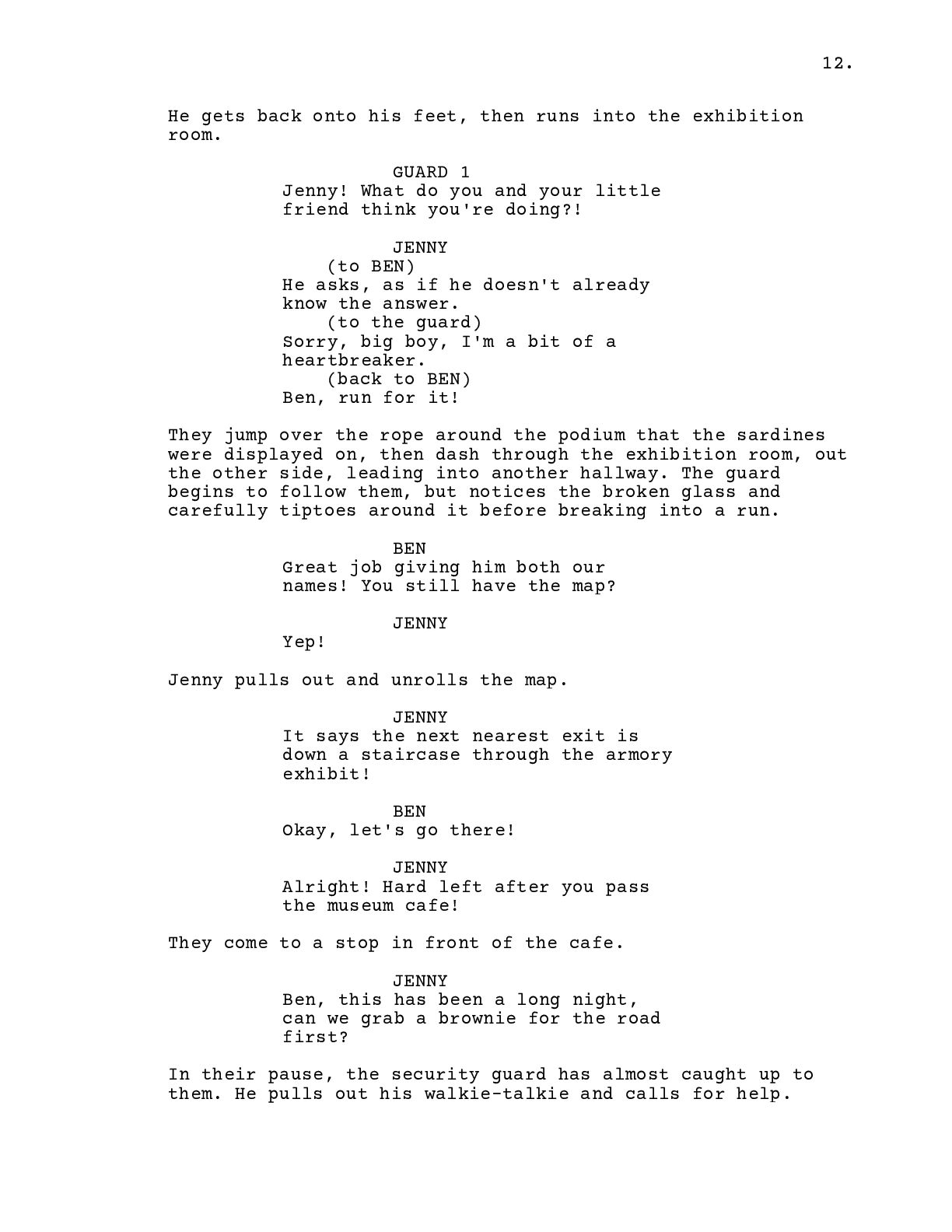 exhibition room. GUARD 1 Jenny! What do you and your little friend think you're doing?! JENNY (to BEN) He asks, as if he doesn't already know the answer. (to the guard) Sorry, big boy, I'm a bit of a heartbreaker. (back to BEN) Ben, run for it! They jump over the rope around the podium that the sardines were displayed on, then dash through the exhibition room, out the other side, leading into another hallway. The guard begins to follow them, but notices the broken glass and carefully tiptoes around it before breaking into a run. BEN Great job giving him both our names! You still have the map? JENNY Yep! Jenny pulls out and unrolls the map. JENNY It says the next nearest exit is down a staircase through the armory exhibit! BEN Okay, let's go there! JENNY Alright! Hard left after you pass the museum cafe! They come to a stop in front of the cafe. JENNY Ben, this has been a long night, can we grab a brownie for the road first? In their pause, the security guard has almost caught up to them. He pulls out his walkie-talkie and calls for help. GUARD 1 12.